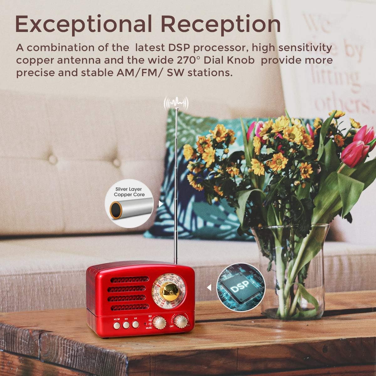 - ♥Ausgezeichneter Empfang: 1)PRUNUS J-160 AM/SW/UKW radio ist mit einem leistungsstarkem DSP-Chip, der ihn empfindlicher beim empfangen von Signalen macht; 2) Ein kreisförmiges Abstimmfenster mit einem Abstimmbereich von 270° verbessert die Empfangsgenauigkeit des Transistorradio erheblich; 3) Kupfer ausziehbare Antenne (bis zu 21cm), macht das Signal noch stabiler.