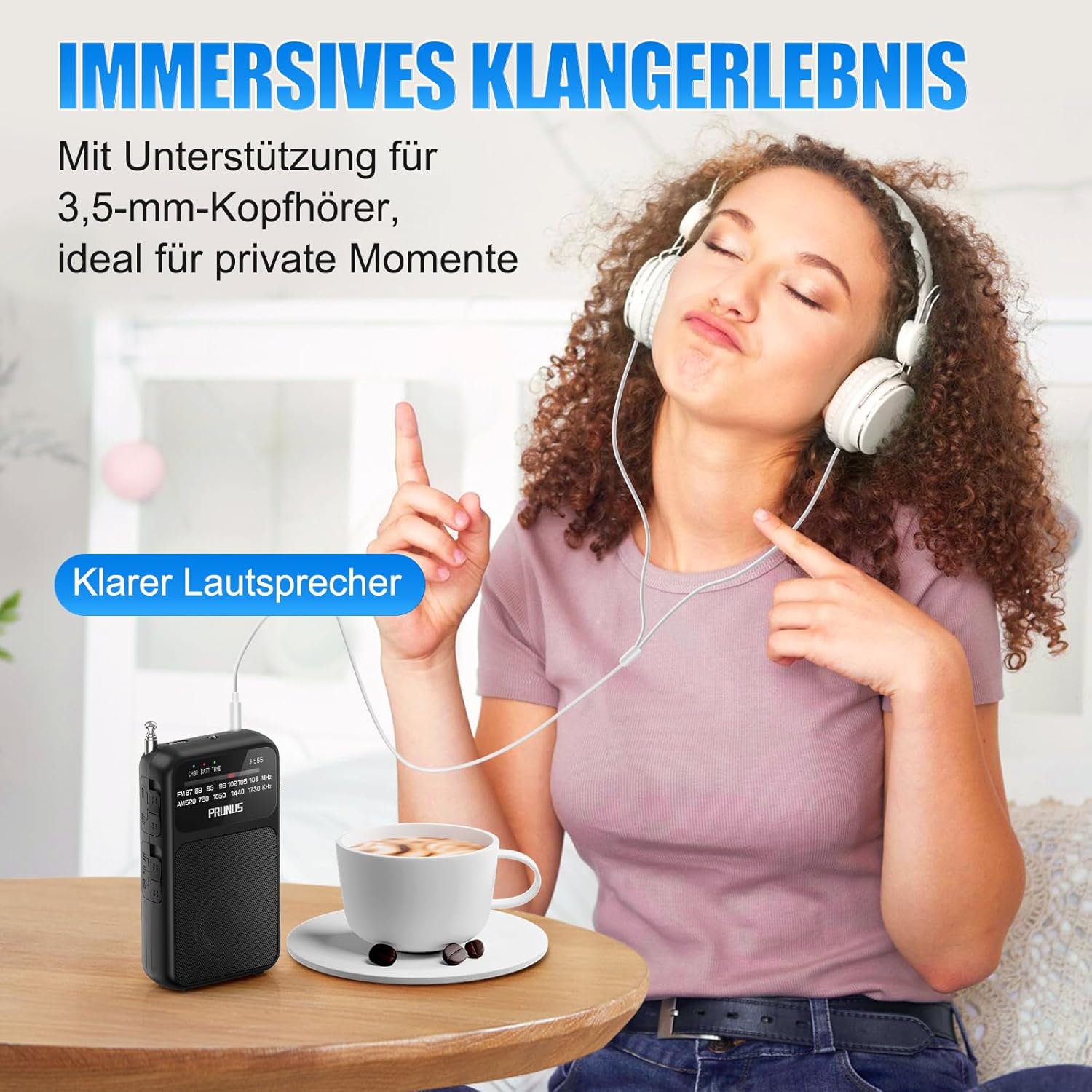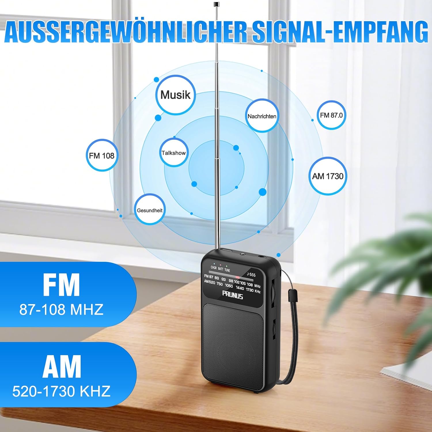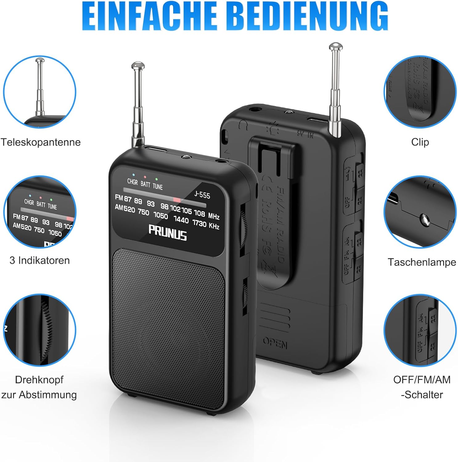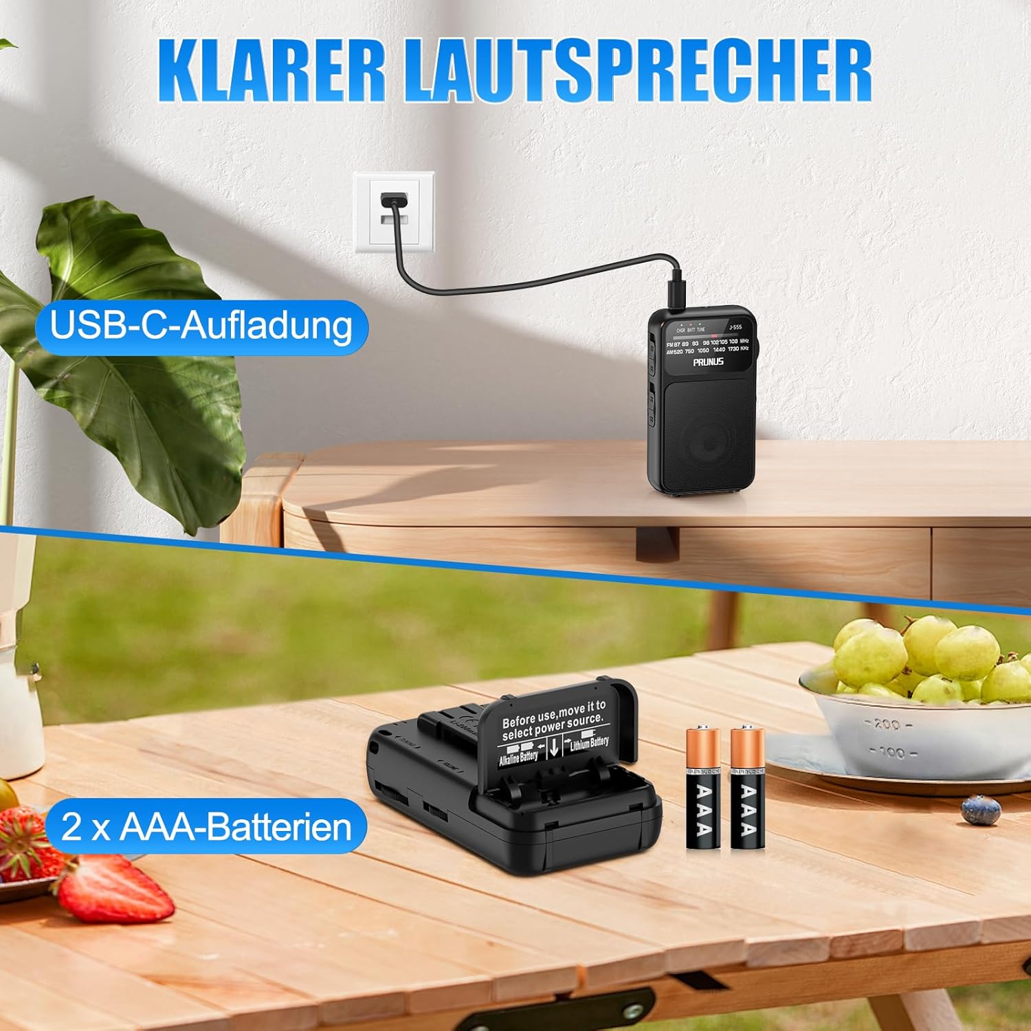 PRUNUS J-555 AM/FM/UKW Radio Klein, Kleines Radio mit Akku, USB-C-Laden, Mini Radio Batteriebetriebe