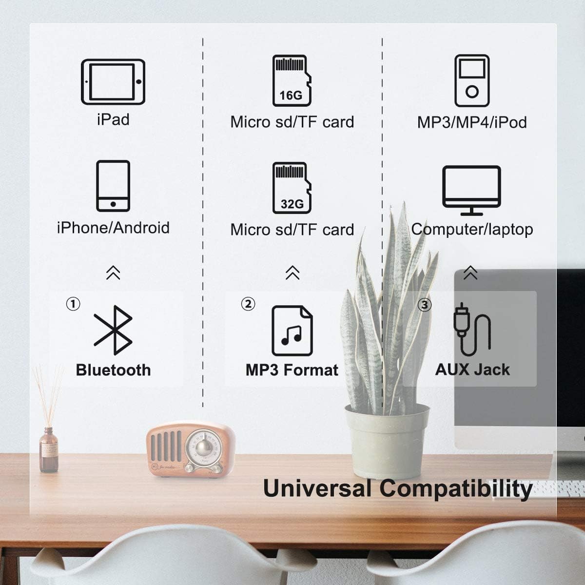 • ♥PERFEKTES MUSIKERLEBNIS: 1) Unterstützt TF-Karte (0-32GB). Bedeutet, dass es eine zusätzliche MP3-Funktion hat. 2) Mit AUX- und Bluetooth-Funktion (10m). Das aux Radio kann sogar als Lautsprecher Ihres Telefons oder Computers funktionieren. 3) Ausgestattet mit einem eingebauten 3W-Magnetlautsprecher, der einen zuverlässigen tiefen Bass und sanfte Höhen liefert. ★(Anmerkungen: keine Kopfhörerbuchse).