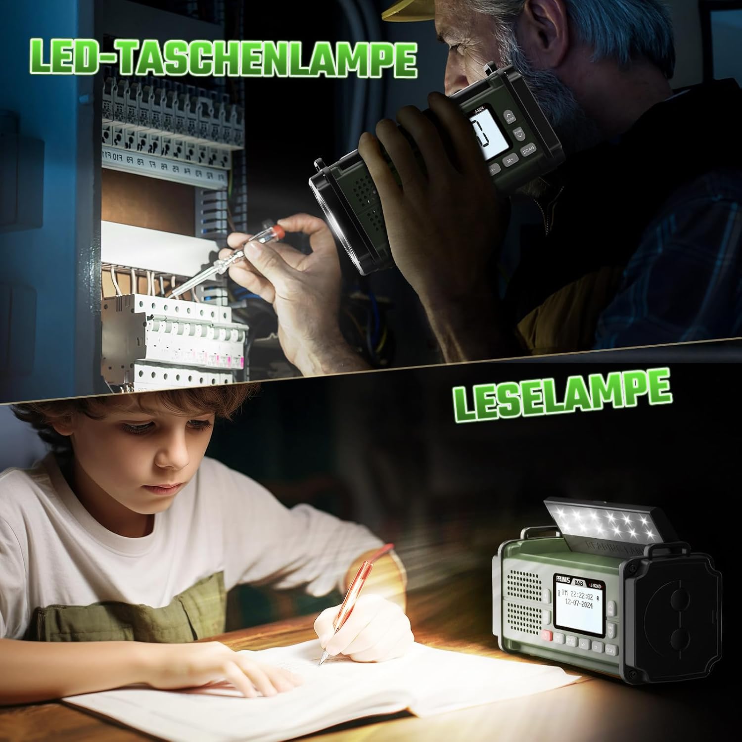 - 【Multifunktionales Tragbares Radio】Dieses J-924 Digitalradio (Abmessungen: 17,1 x 9,1 x 7,1 cm, Gewicht: 568 g) ist nicht nur ein DAB/FM Radio, sondern auch ein Bluetooth-Lautsprecher . Es über verfügt über einen SOS-Alarm und einen eingebauten