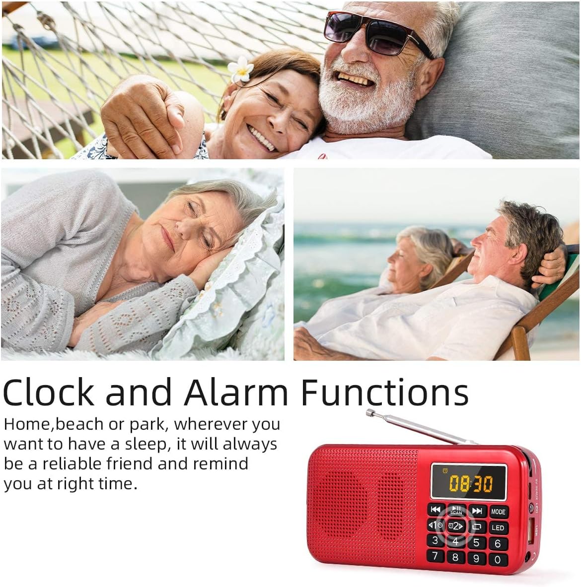 • Vertrautes funktionales Design: 1) Mit Uhr und Wecker Funktion. 2) Kann als MP3-Player verwendet werden, unterstützt SD-Karte und USB-Laufwerk mit MP3-Datein. 3) Ladeanzeigen: rot = Laden, grün = voll geladen.