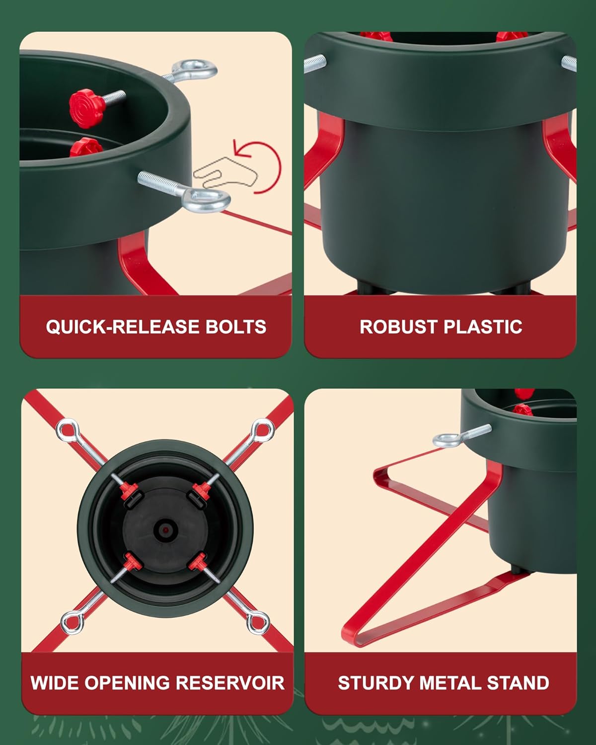 • Weihnachtselemente – Unser Weihnachtsbaumständer mit Wassertank ist inspiriert von klassischen Weihnachtsfarben. Der grüne Sockel und die roten Standfüsse harmonieren perfekt mit traditioneller Weihnachtsdekoration. Hergestellt aus hochwertigen