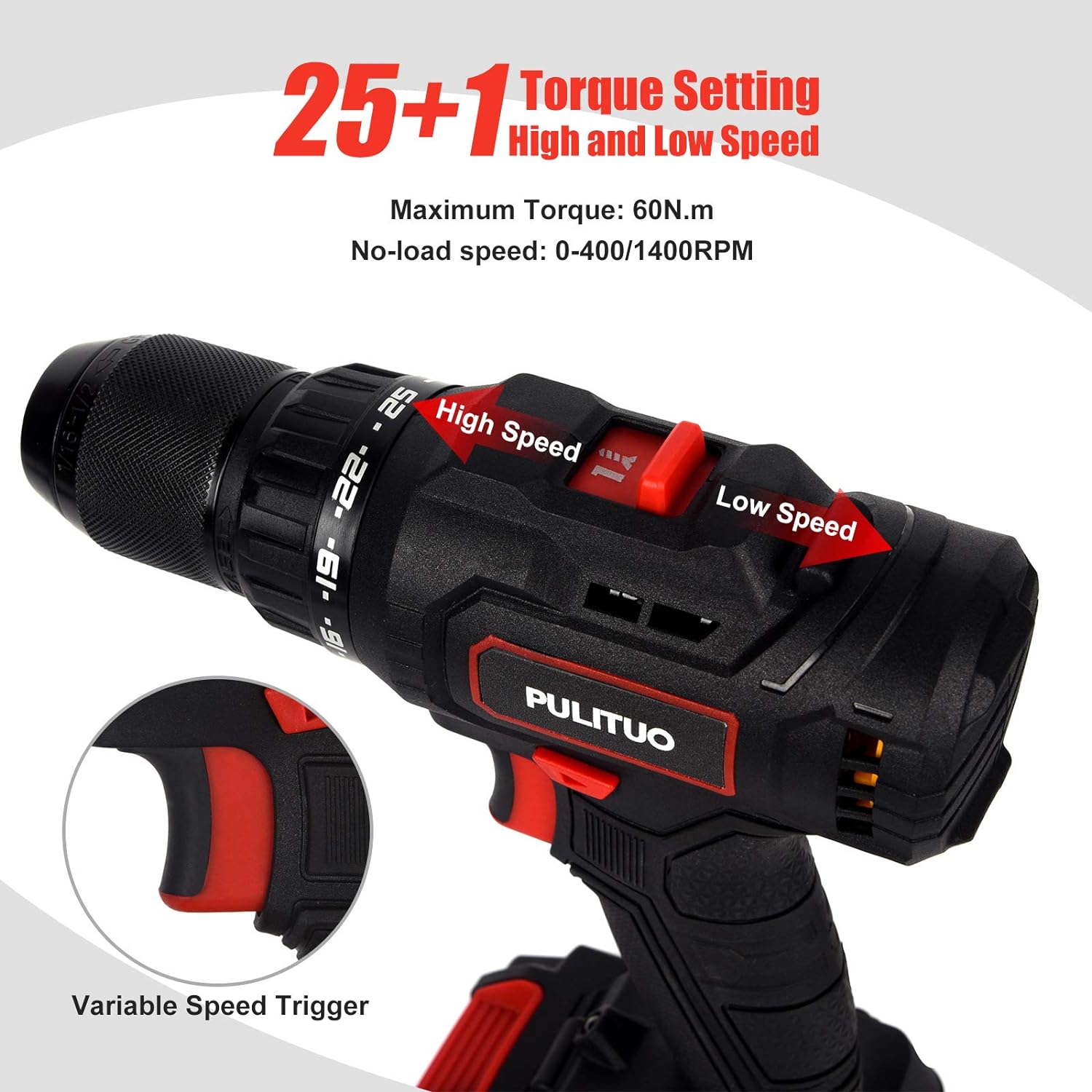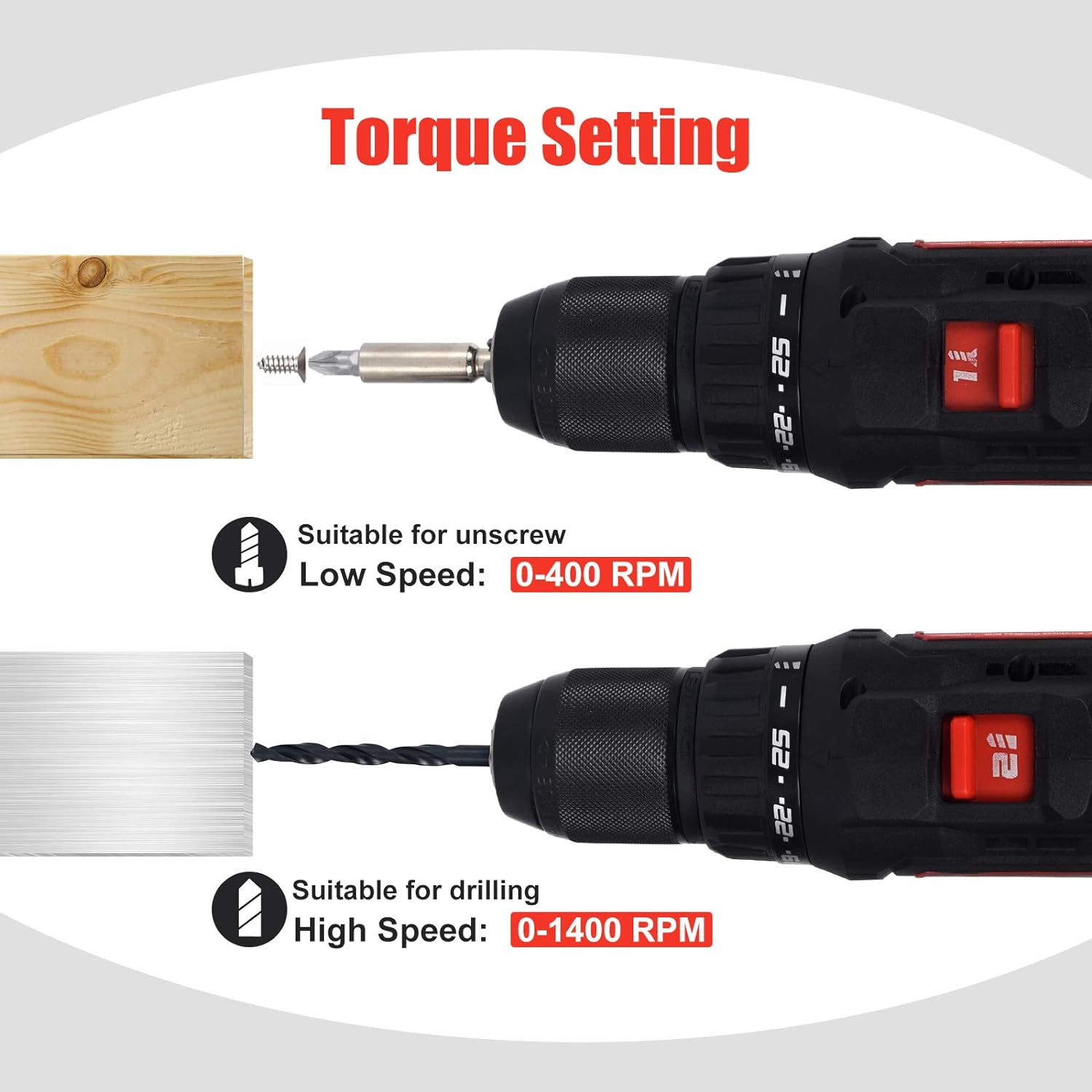 - 2 variable Drehzahl und 25 + 1 Drehmomenteinstellung: Die 20v-Bohrer bieten zwei Drehzahlen (0-400 U / min oder 0-1400 U / min), 25 + 1 Drehmomenteinstellung für eine Vielzahl von Anwendungen, so dass Sie variable Drehzahlregelung ermöglichen. Licht