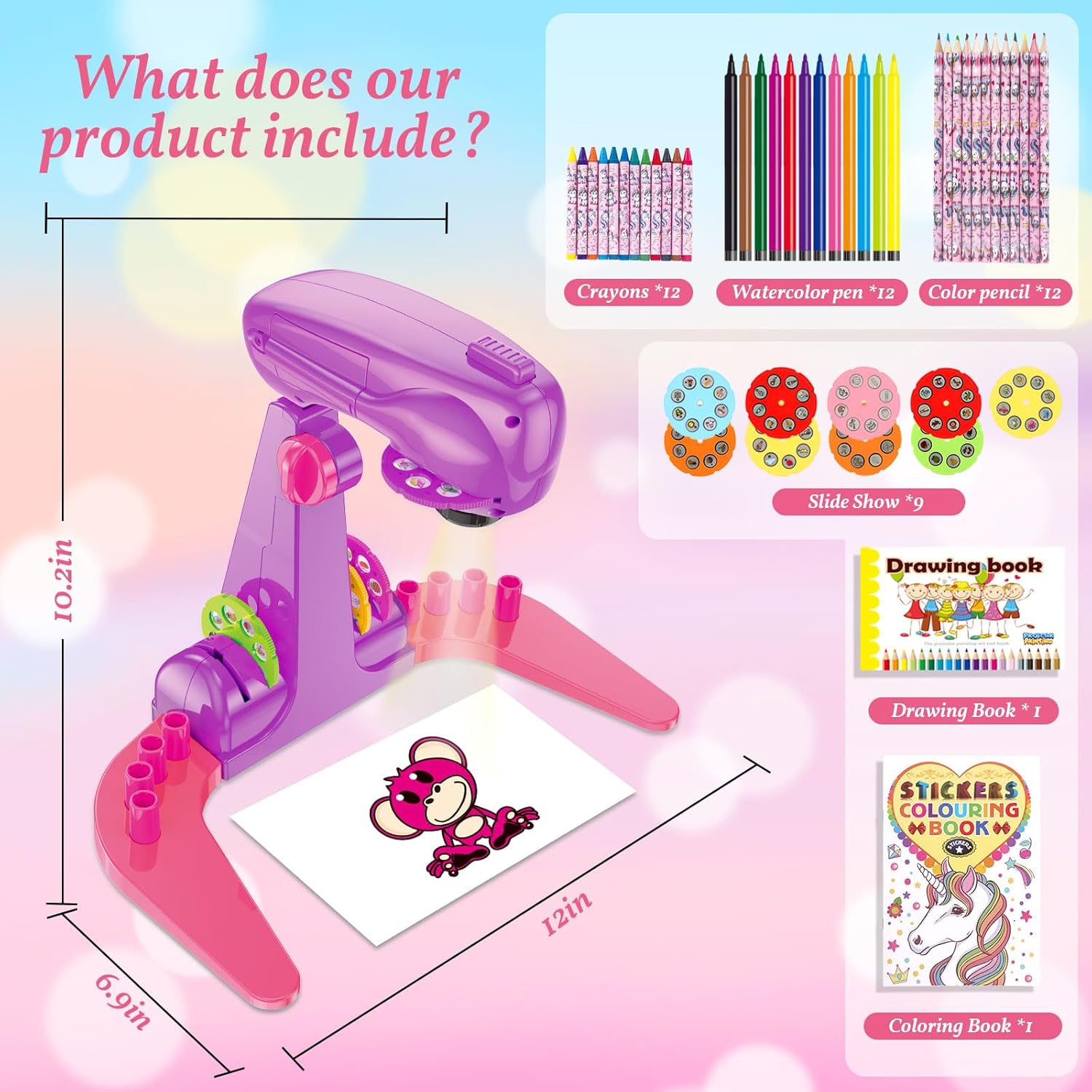 - Lustiger Malprojektor für Kinder: Das Projektions-Malset für Kinder enthält einen 52,5*38,5*50,5 cm grossen Zeichenprojektor, Einhorn-Buntstifte*12, Einhorn- Bleistifte*12, Aquarellstifte*12, ein Zeichenlineal*7, ein Zeichenbuch*1, ein