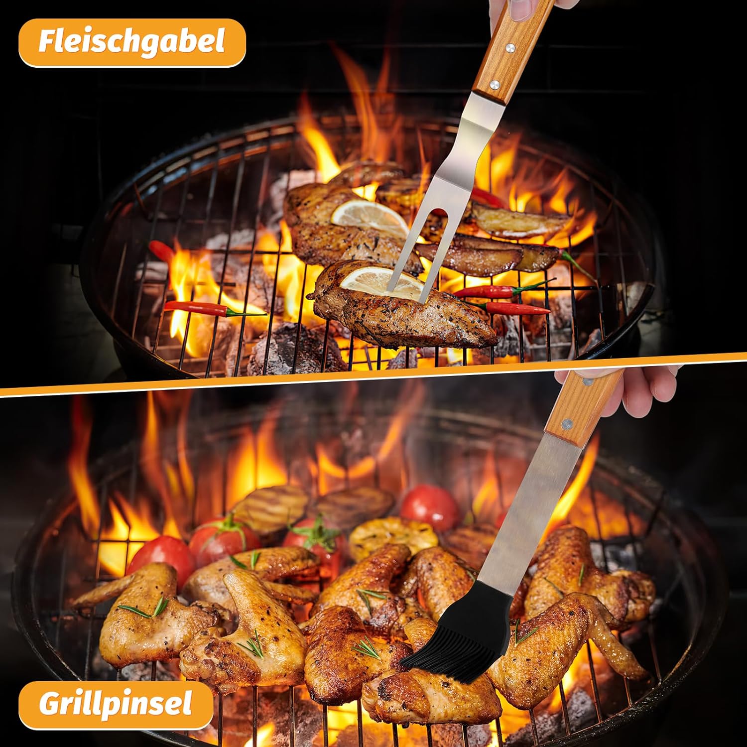 - Hohe Qualität und Langlebigkeit - Extra dickes, solides Grillbesteck aus lebensmittelechtem Edelstahl mit polierten Holzgriffen, ergonomisches Design für komfortablen. Gebrauch wärmeisoliert und hitzebeständig, rostet nicht