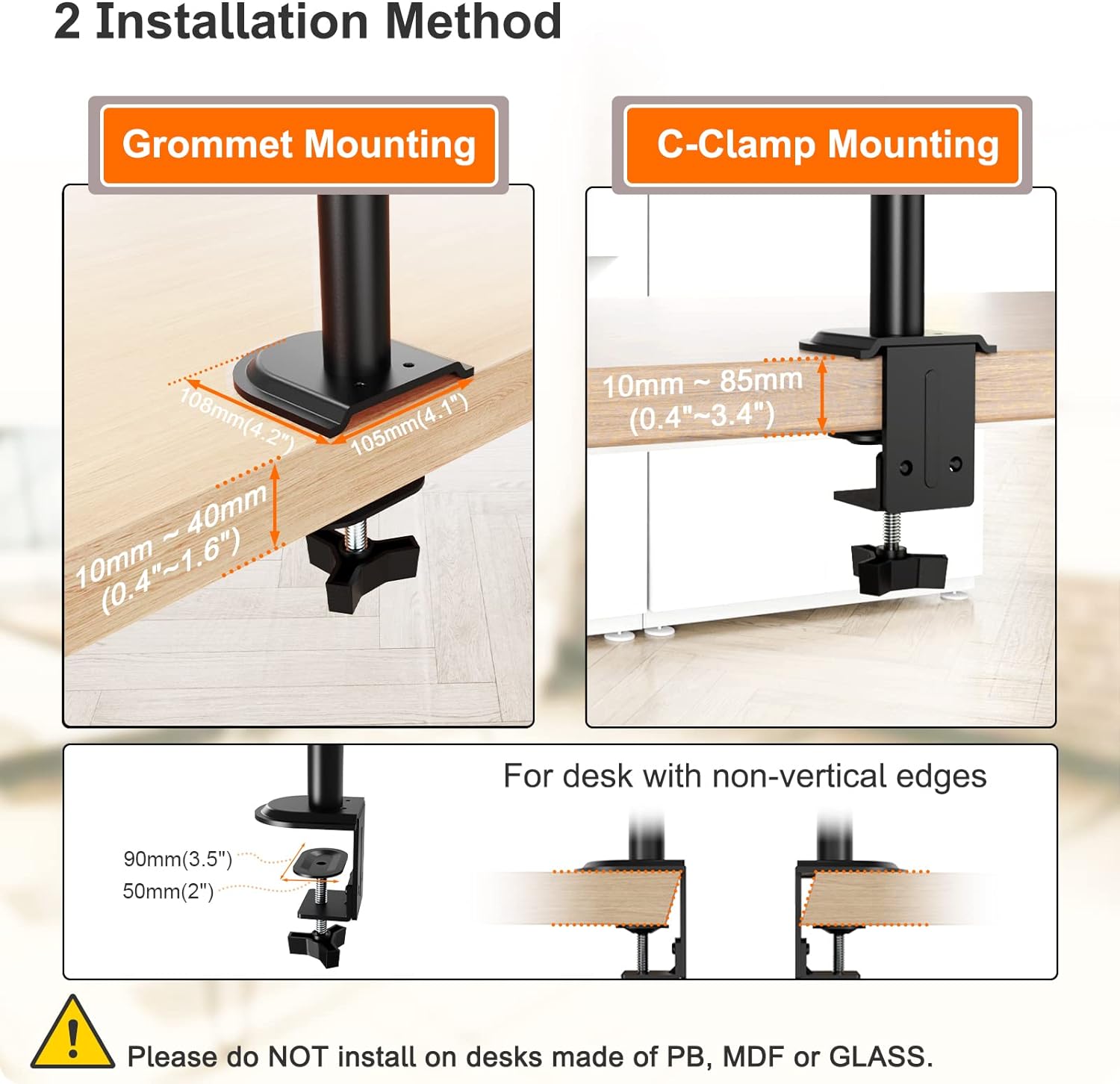 - Passt zu verschiedenen Arten von Schreibtischen: Dual monitor halterung kann entweder mit der mitgelieferten C-Klemme (bohrfrei) oder mit der Grommet-Hardware (erfordert Bohren eines Lochs) montiert werden. Die Klemmmethode passt zu den meisten