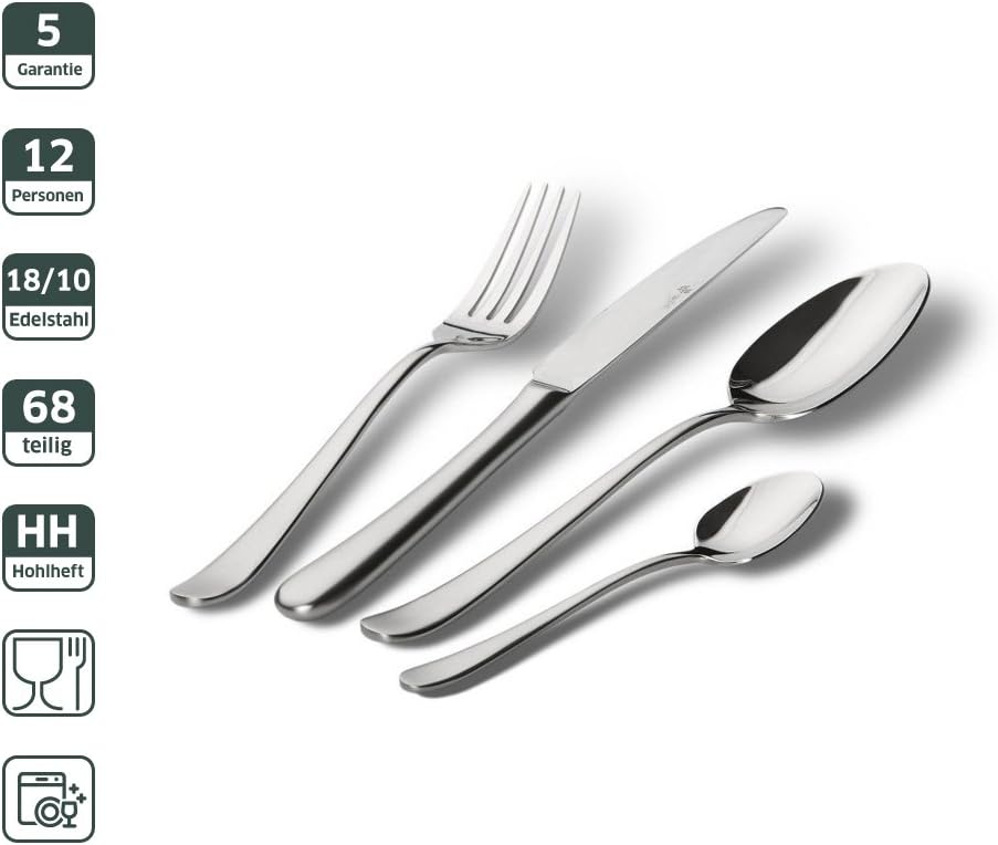 • KEYFACTS: Je 12 x Menü-Messer, Menü-Gabel, Menü-Löffel, Kaffee-Löffel & Kuchen-Gabel, je 2 x Fleisch-Gabel und Servier-Löffel, je 1 x Saucen-Löffel, Tortenheber, Sahne-Löffel & Zucker-Löffel. 18/10 Edelstahl. Geradlinige Form.