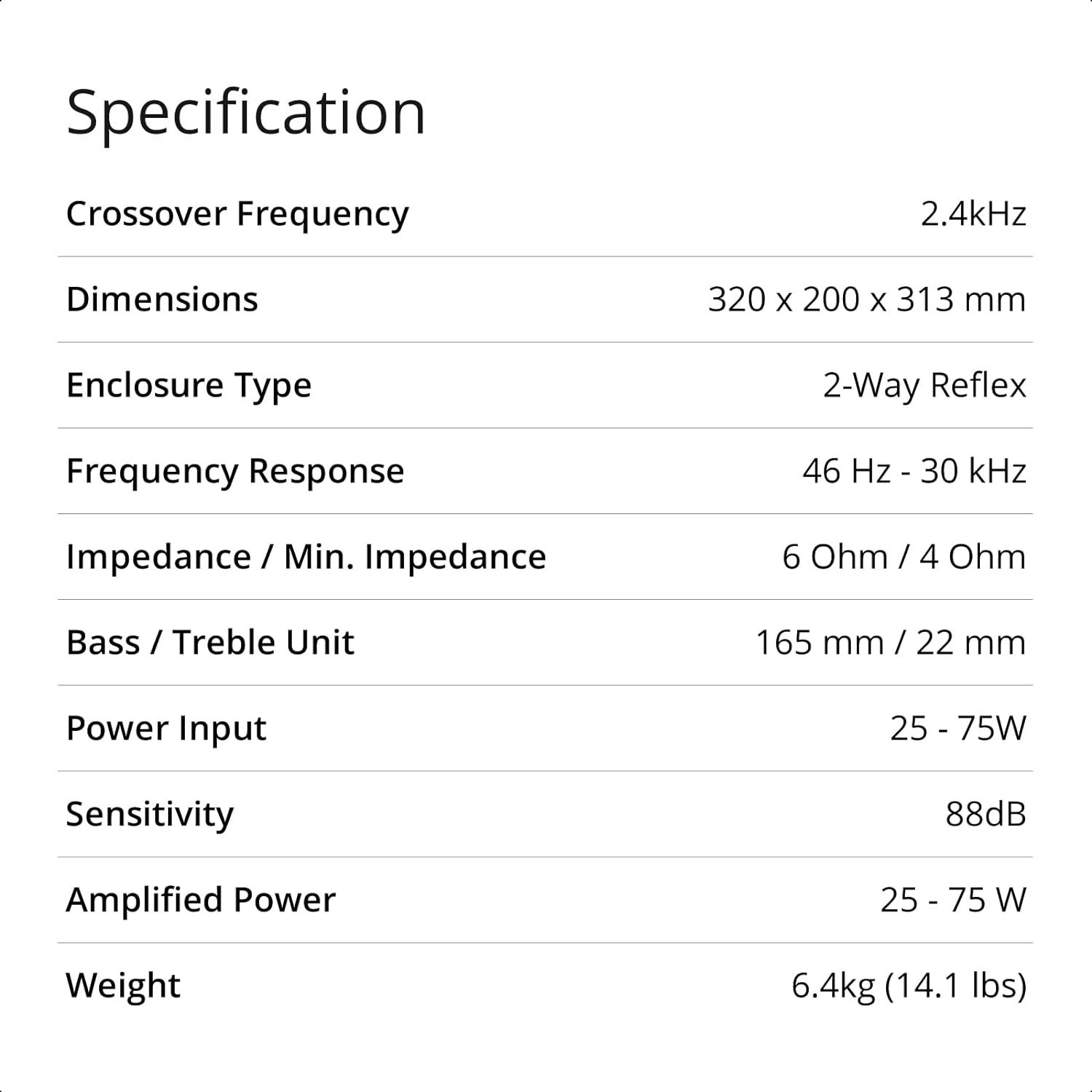 - Gehäusetyp: 2-Wege-Reflex, Bass-Treiber: 165mm (6.5in), Hochtöner: 22 mm, Frequenzgang: 46 Hz 30 kHz, Impedanz: 6 Ohm, minimale Impedanz: 4 Ohm, Empfindlichkeit: (2,83 V @ 1 m) 88 dB, Netzeingang: 50 145 W, Cross-Over-Frequenz: 2,4 kHz, Masse (BxHxT):