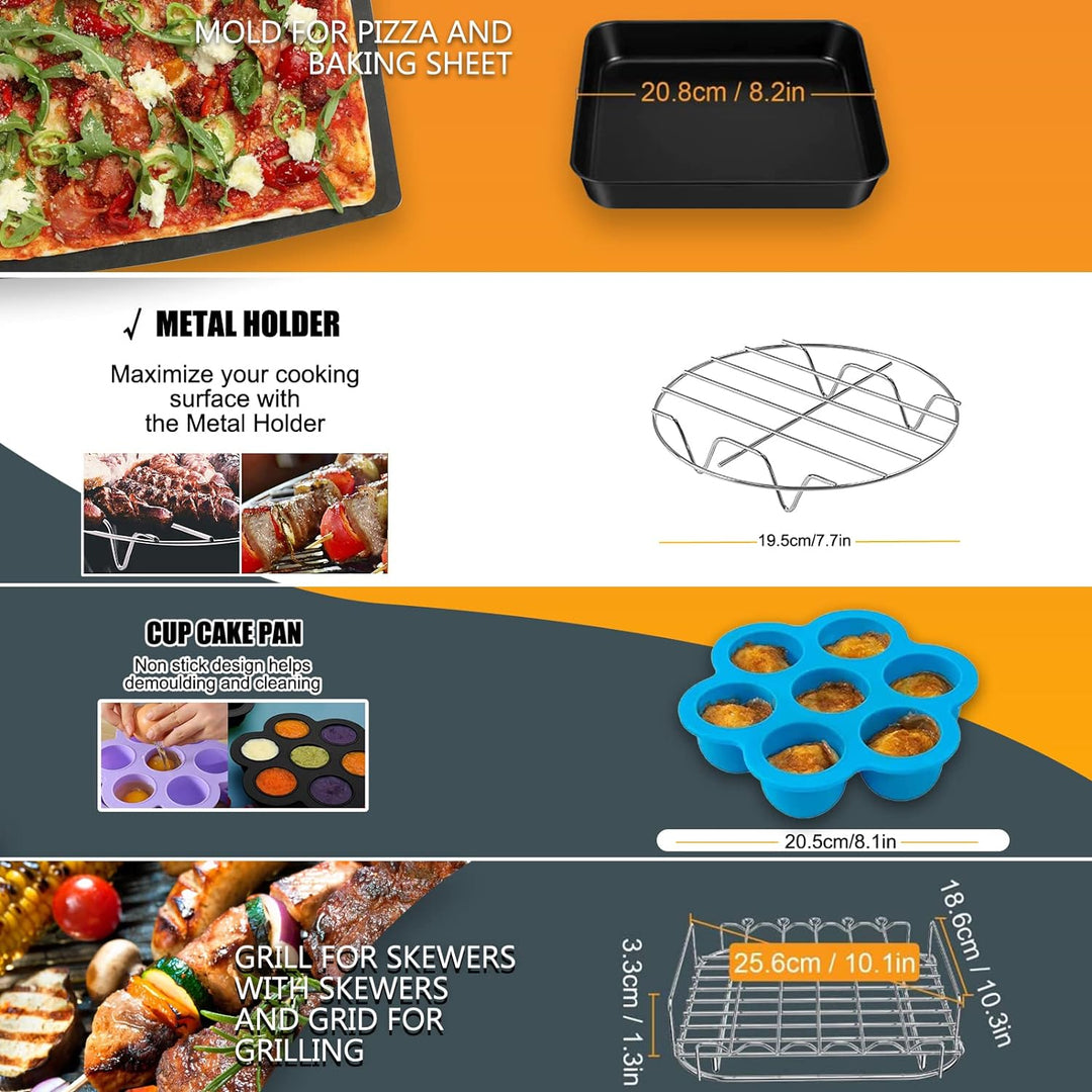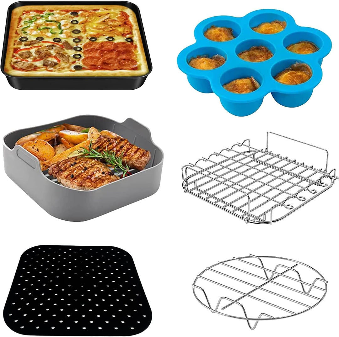 - Komplettes Zubehör: Dieses 6-teilige Set von Airfritteusen-Zubehör beinhaltet: 20,5 cm quadratische Silikonpfanne, 20,8 cm quadratische Antihaft-Pizzapfanne, 215 cm Silikonmatte, 25,6 cm Grill, 20 cm Kuchenform und 19,56 cm Metallständer.
