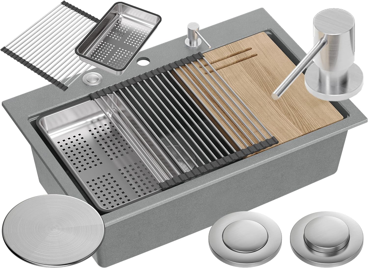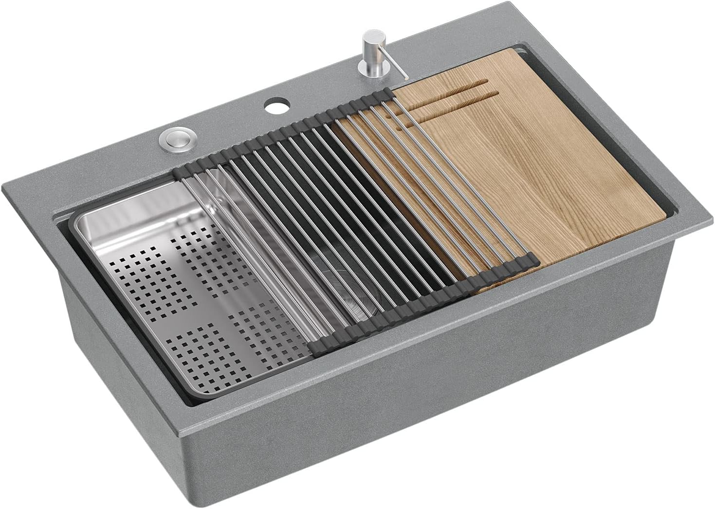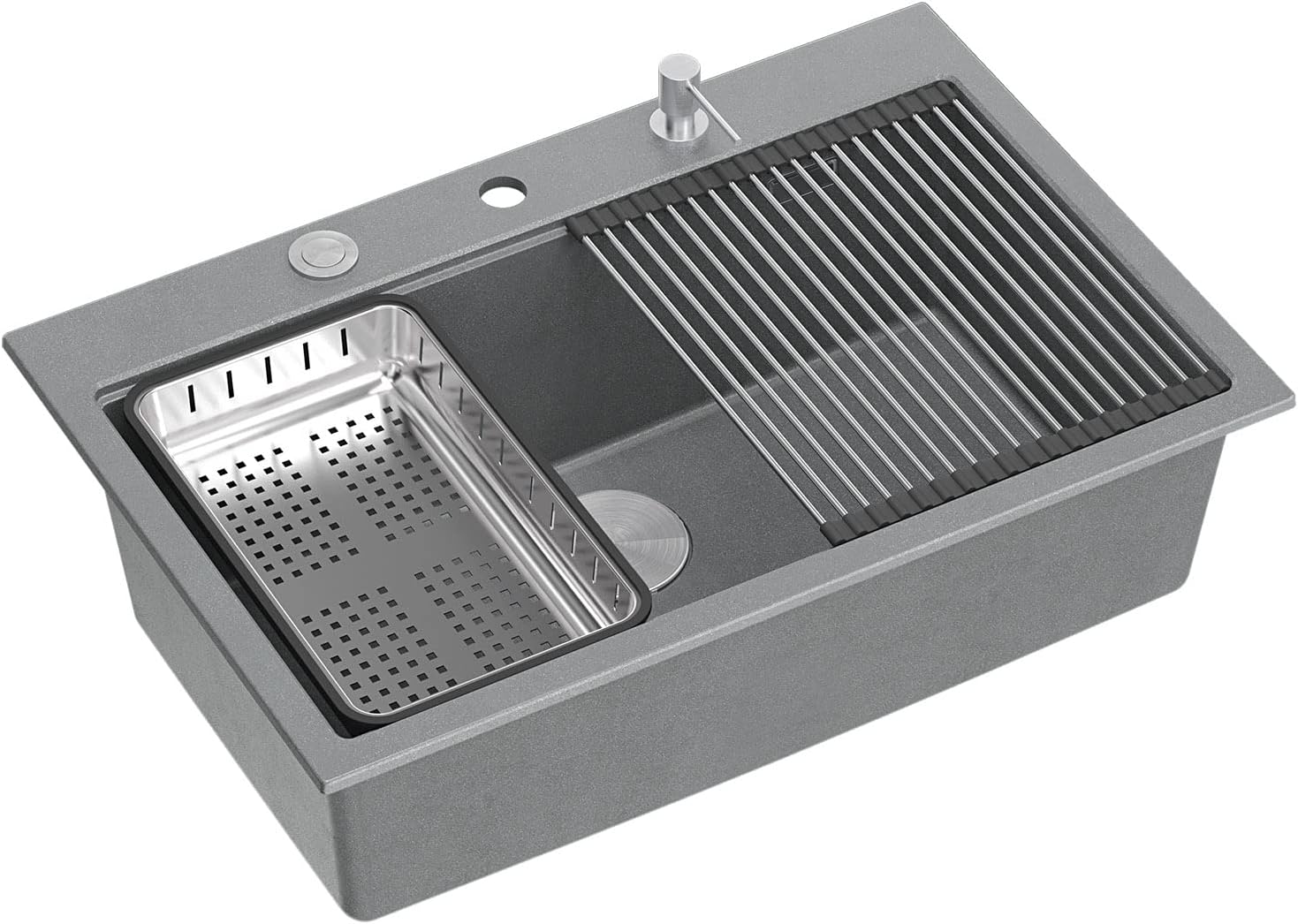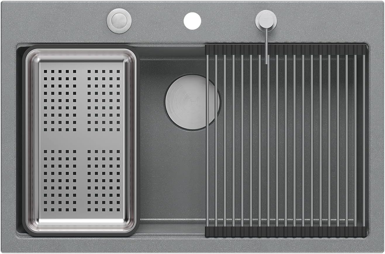 - Das GraniteQ-Material besteht aus feinen Granitpartikeln (75-80 %), die mit einem hochwertigen Bindemittel (20-25 %) verbunden sind, wodurch die Spüle aussergewöhnlich langlebig und widerstandsfähig ist.