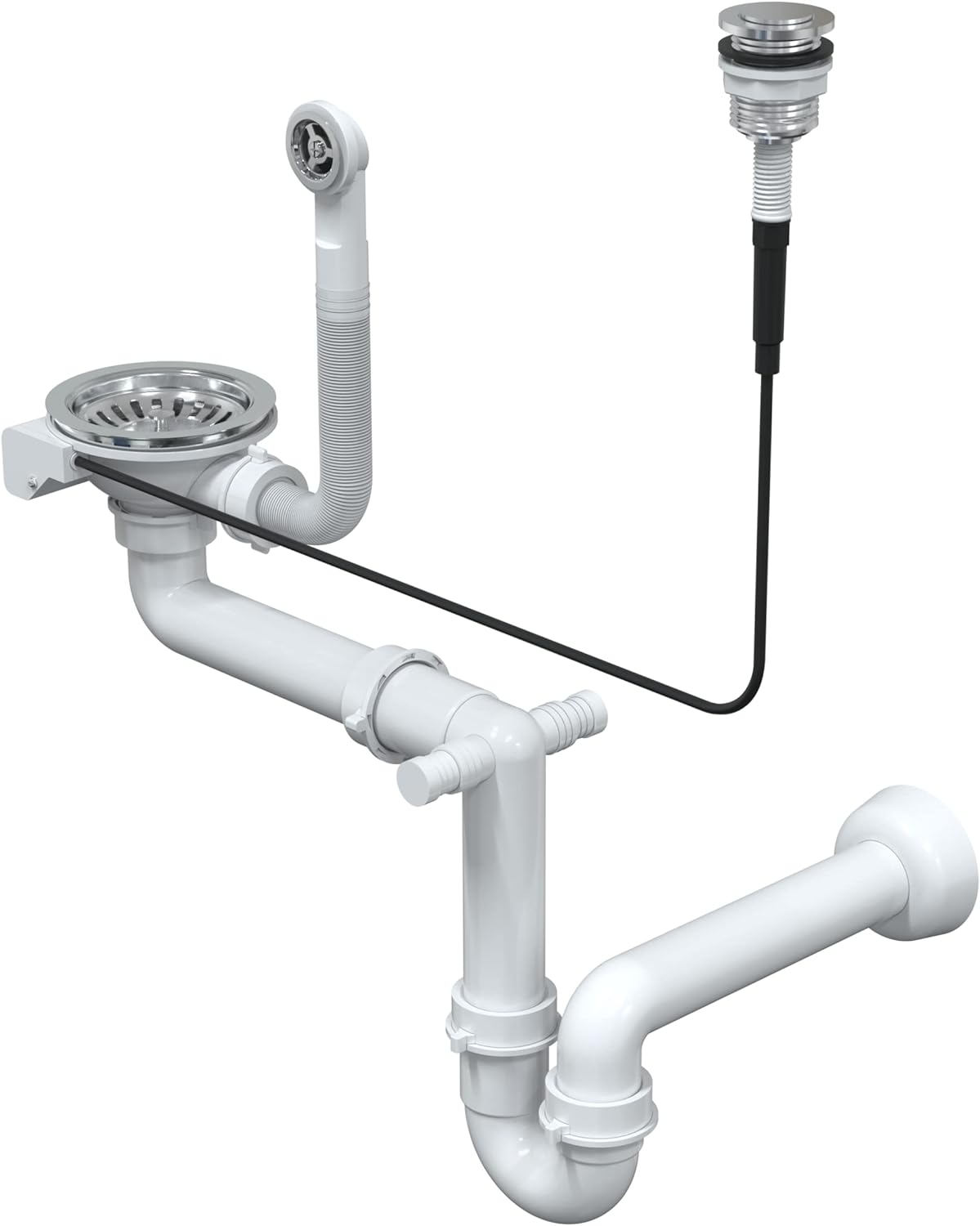 - Das Set beinhaltet einen 3 1/2" Push-2-Open Wandablauf mit Siphon und ein Schneidebrett aus Holz 38 x 28 x 2 cm (Esche)