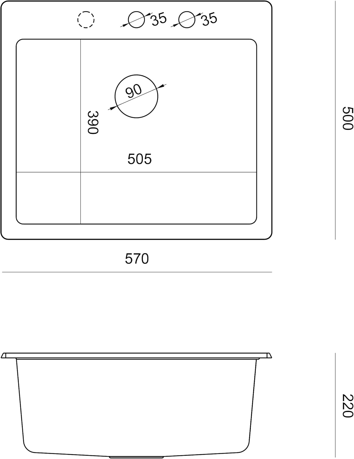 - Abmessungen der Spüle: 57 x 50 x 22 cm