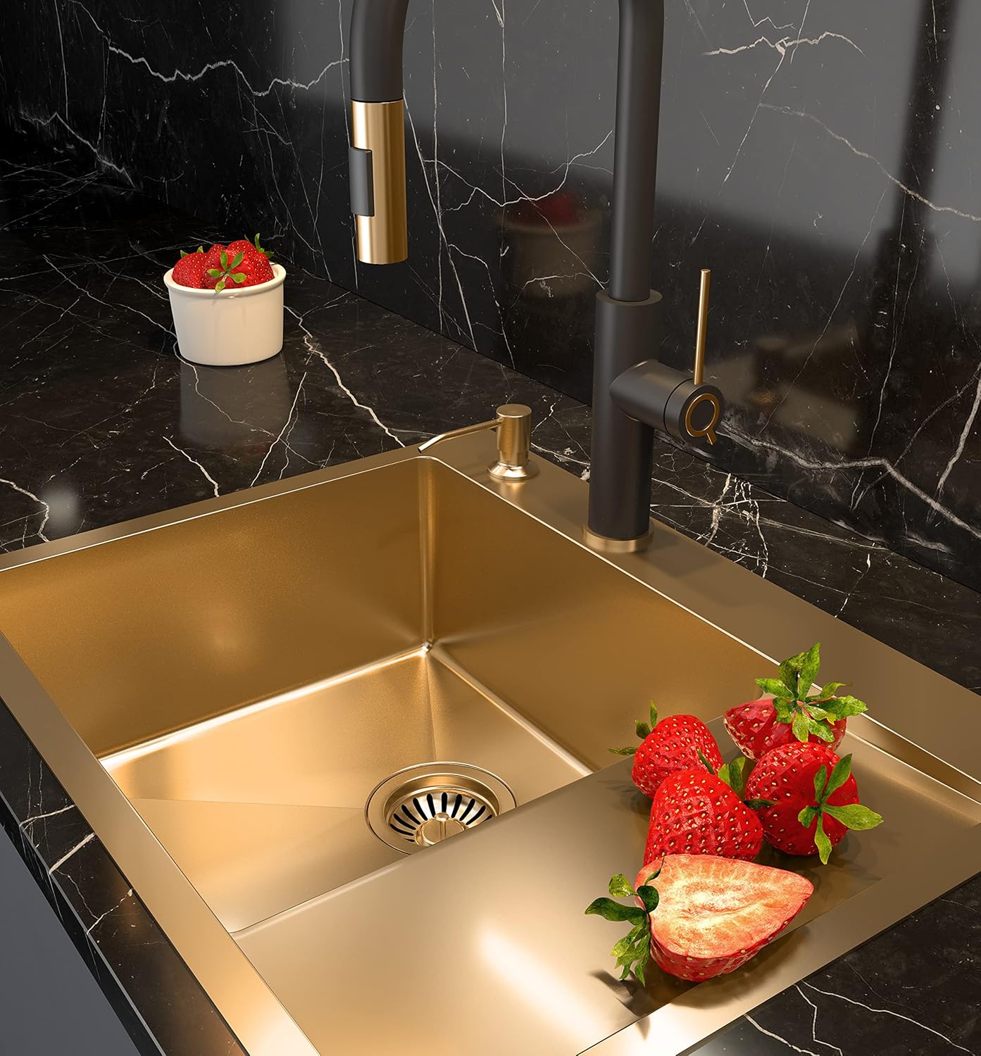 • Die Spüle ist aus 1 mm starkem SteelQ-Edelstahl mit PVD-Technologie gefertigt, der maximale Hygiene und Haltbarkeit garantiert.