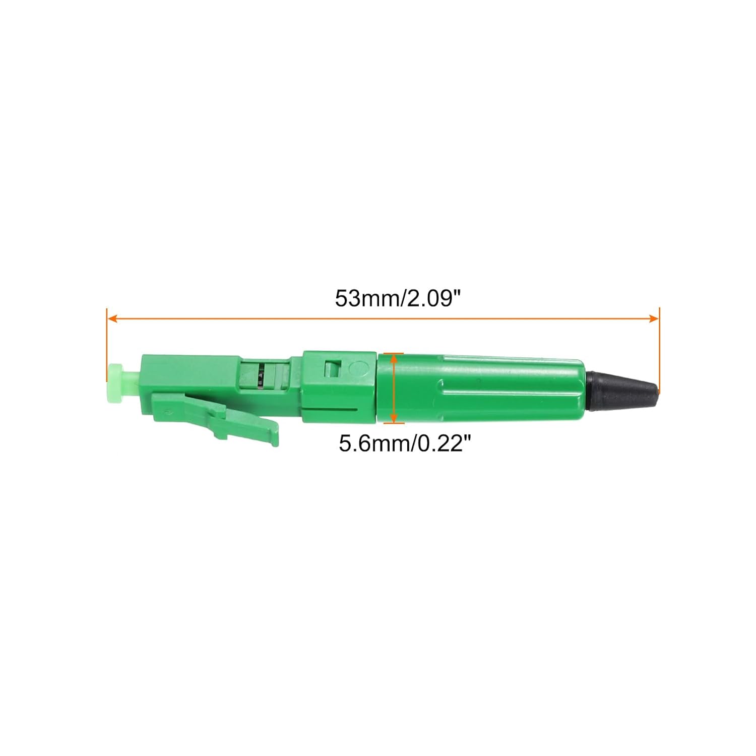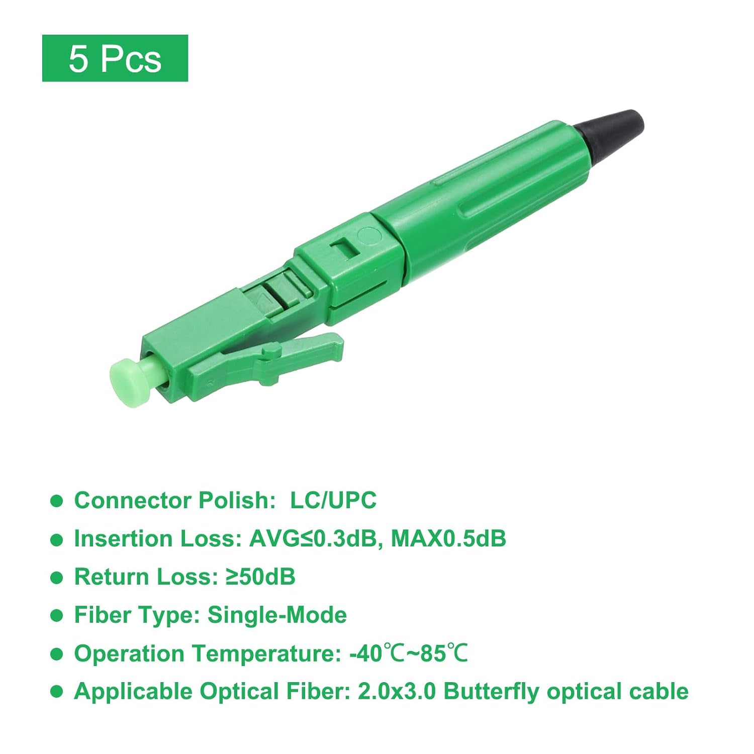 - Der LC-Glasfaser-Schnellverbinder-Adapter hat folgende Abmessungen: 53x6,5 mm; Stil: Glasfaser-Schnellverbinder; Anschlusspolitur: LC/APC; Einfügungsverlust: AVG≤0,3 dB, MAX0,5 dB; Rückflussdämpfung: ≥50 dB; Fasertyp: Single-Mode;