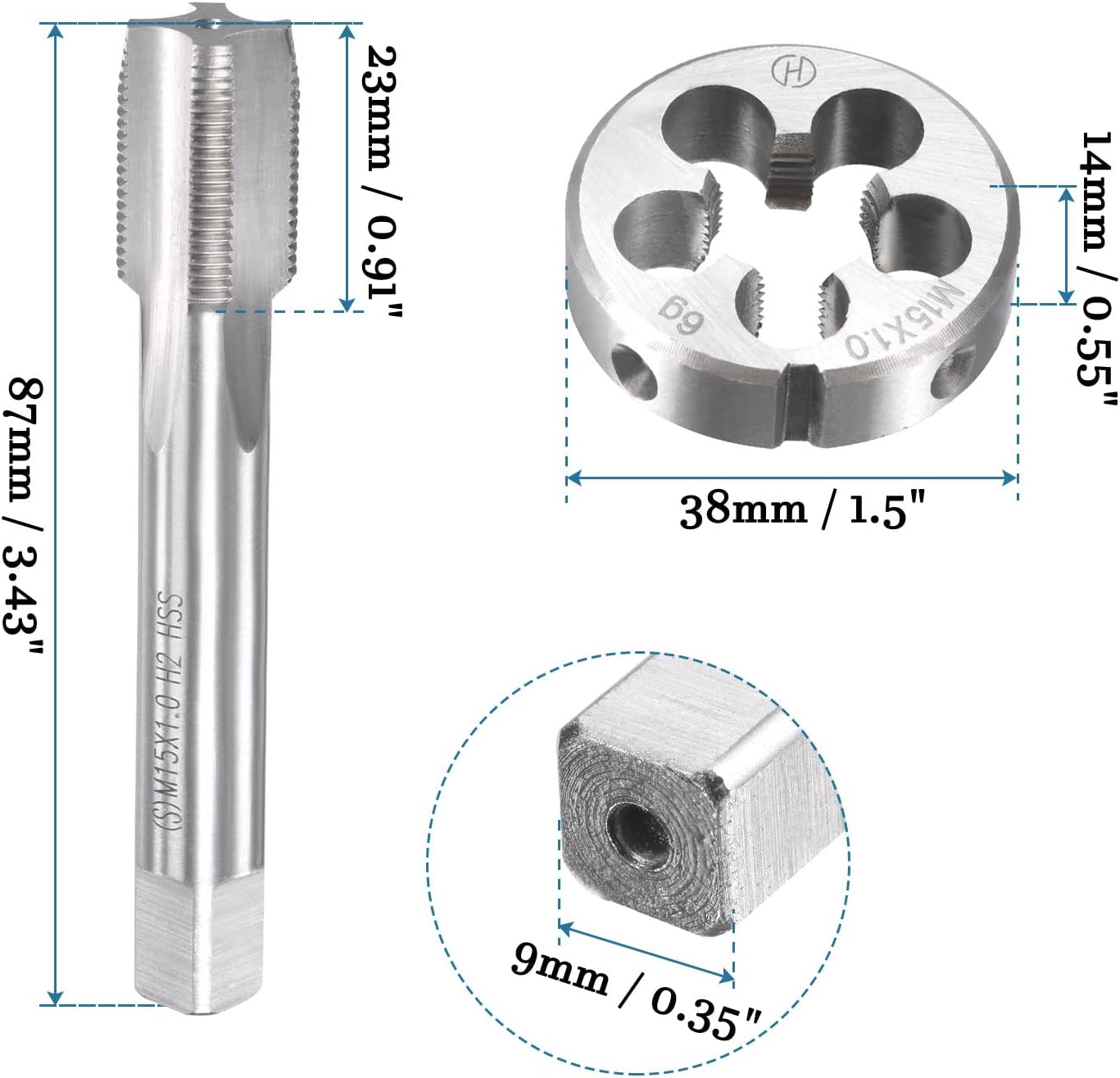 • ! Abmessung - Gewindebohrer: Gewinde Grösse: M15 x 1mm. Gewinde Länge: 23mm / 0.91". Gesamte Länge: 87mm / 3.43". Quadrat Schaft Grösse: 9mm / 0.35". Runde Matrize: Gewinde Grösse: M15 x 1mm. Aussendurchmesser (AD): 38mm / 1.5". Dicke: 10mm / 0.39".