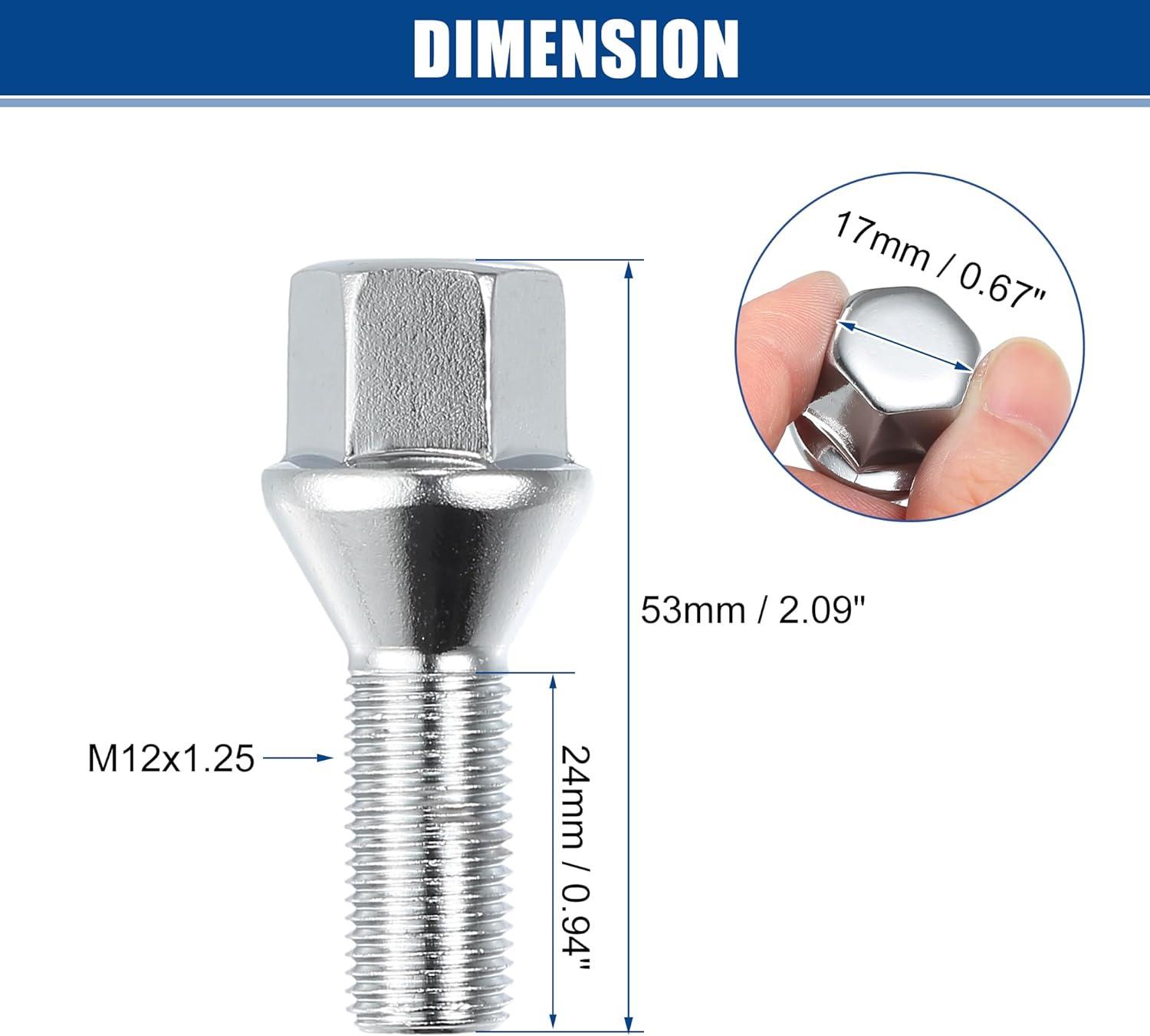 • Merkmale: Gewindegrösse: M12x1.25, Diagonale Grösse: 17 mm / 0,67 Zoll, Gewindelänge: 24 mm / 0,94 Zoll, Gesamtlänge: 53 mm / 2,09 Zoll.