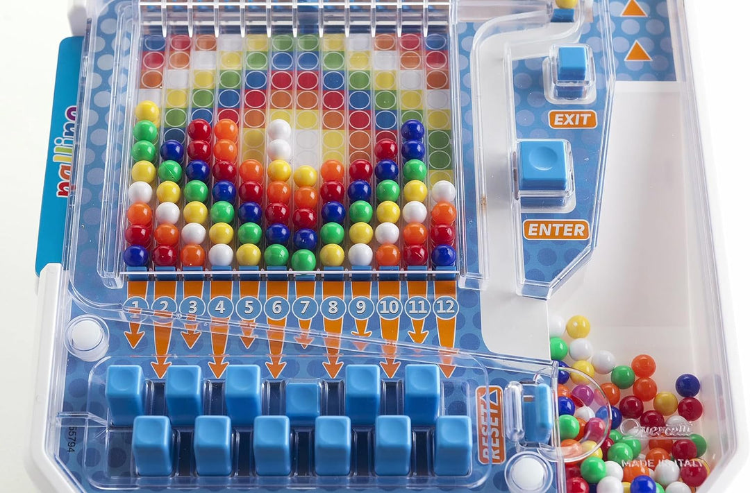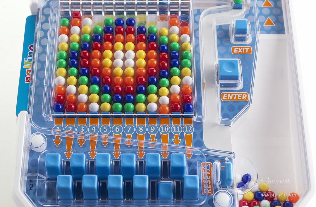 - Die Ansicht ist in 12 Säulen unterteilt, jeder Säule entspricht eine Taste: um die Kugeln in die gewünschte Säule zu bringen, muss nur die entsprechende Taste gedrückt und auf den Auslöseknopf geschlagen werden