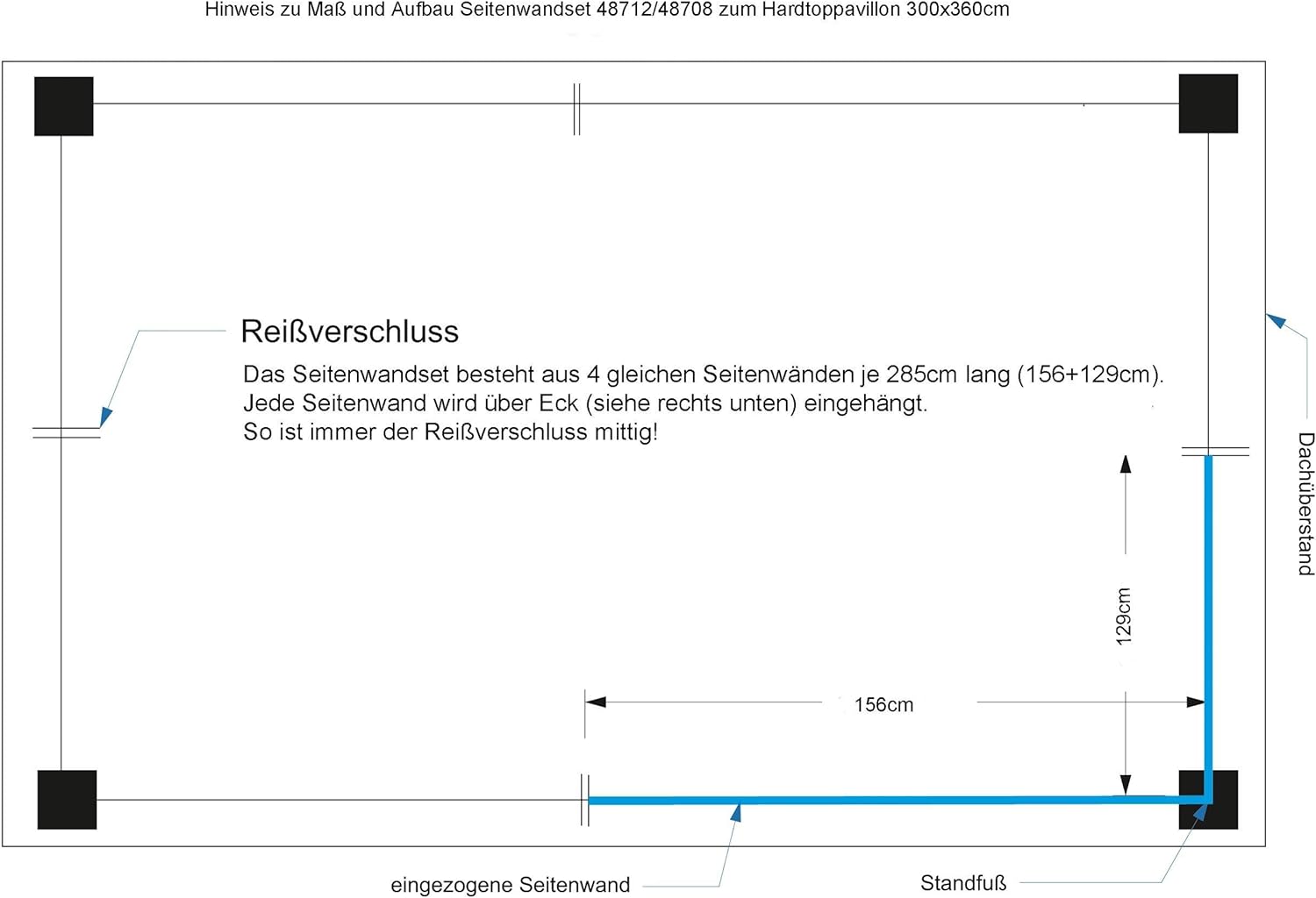 - Befestigung: 44 Ösen am oberen Rand inklusiv 2 Sorten an Haken und Ringen für die wahlweise Befestigung an allen Pavillonmodellen.