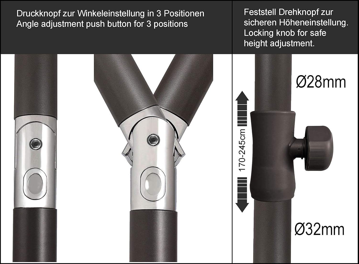 - Schirmhöhe: von 170-245cm einstellbar