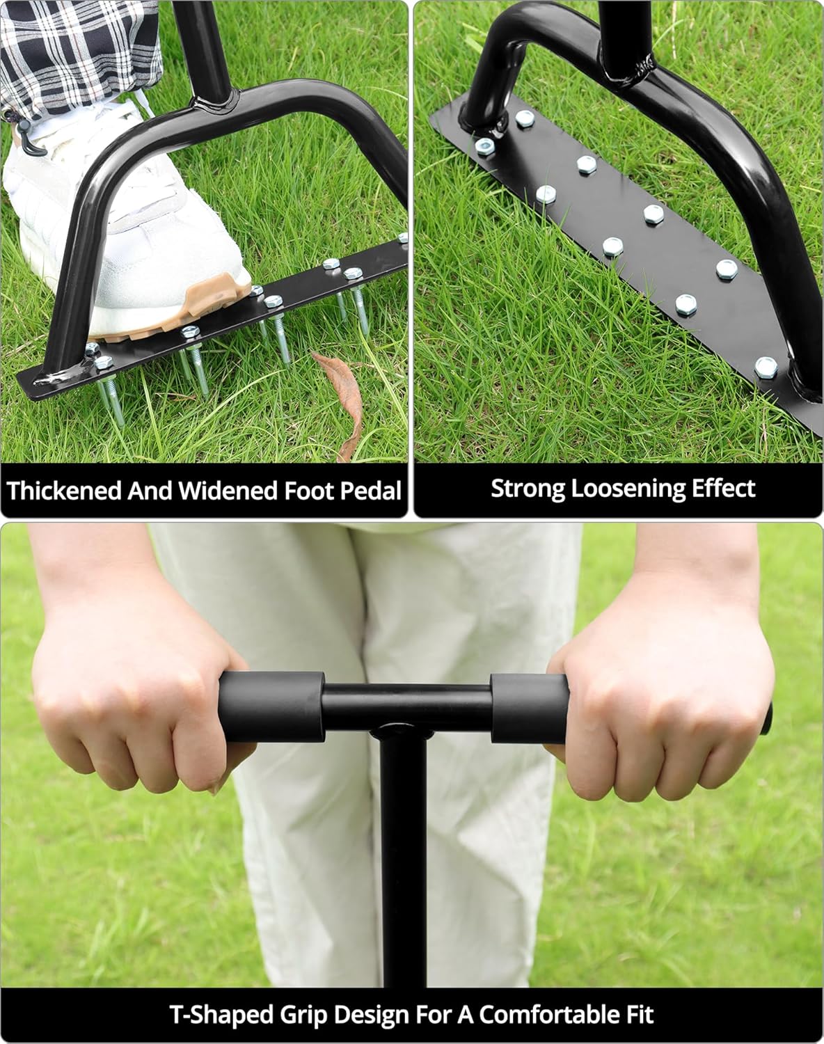 • Design: Breite Fussrasten sorgen für maximale Abwärtskraft und Balance für eine effiziente Belüftung. Wird mit 10 Spikes geliefert, um verdichteten Boden leicht zu durchdringen und zu lockern