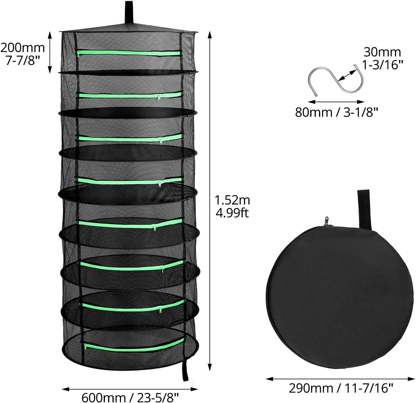 - Produktgrösse: Der Durchmesser des Trockennetzes beträgt 60 cm. Die entfaltete Grösse beträgt: Jede Schicht ist 20 cm hoch, die Gesamthöhe beträgt 170 cm und die gefaltete Grösse beträgt 23 x 23 x 10 cm (9,06 x 9,06 x 3,94 Zoll).