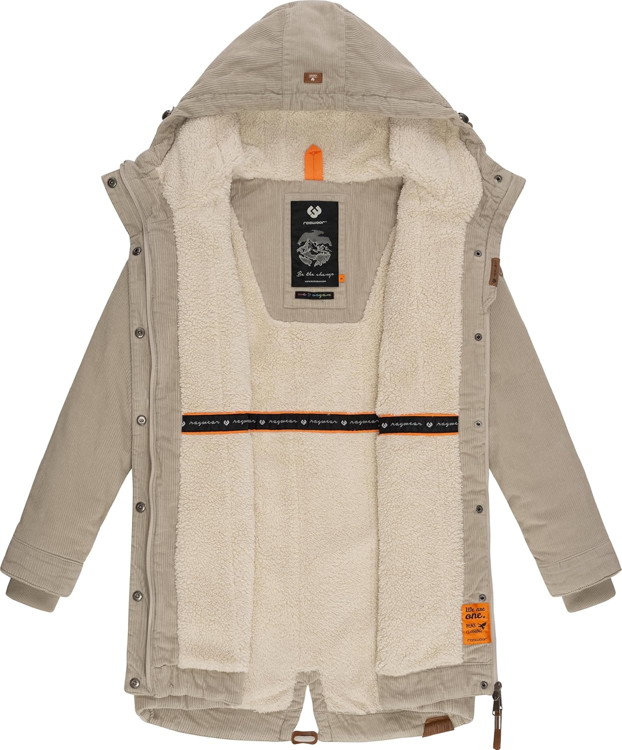 - LOOK: Stylischer gefütterter Mantel aus Kord mit Kapuze, weichem Innenfutter aus Teddyfell und dicken Tunnelzugkordeln vom angesagten Street-Wear Label Ragwear