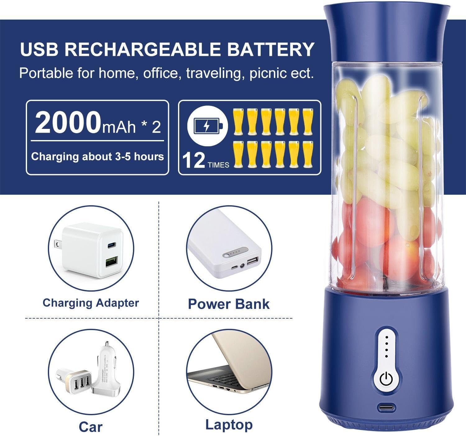 - 【Aktualisierte Klingen & Mehr Leistung】TDie 6 Edelstahlklingen mit 2000mAh x 2 Batterien können den 7,4V Motor und die 18.000rpm Geschwindigkeit antreiben, so dass der tragbare Smoothie Mixer Ihre gewünschten Säfte und Smoothies in 30 Sekunden