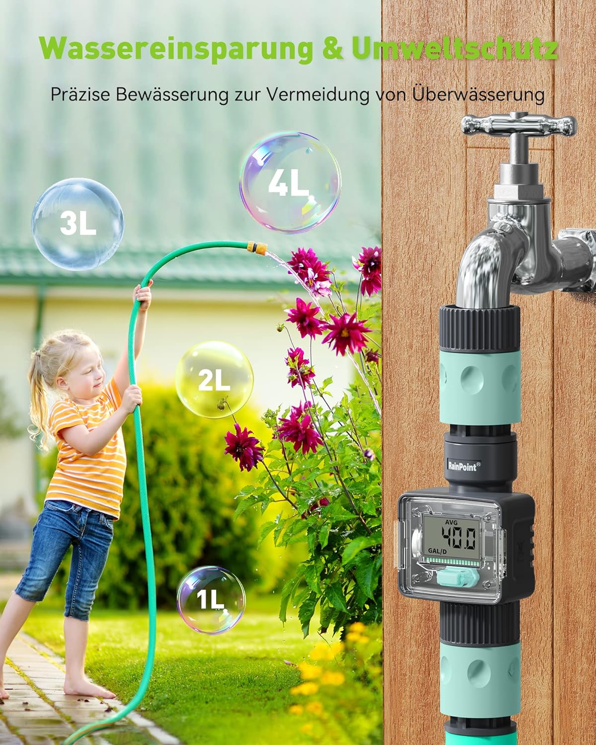 - 4 Modi der Wasserdurchflussmessung: Der Wasseruhr garten verfügt über Echtzeit-Wasserdurchflussmessung, letzten Wasserverbrauch, täglichen durchschnittlichen Wasserverbrauch von 7 Tagen, Gesamtwasserverbrauch. Der Wasserzähler hilft, die Wassermenge zu kontrollieren und hilft, lokale Wasserbeschränkungen besser durchzusetzen.