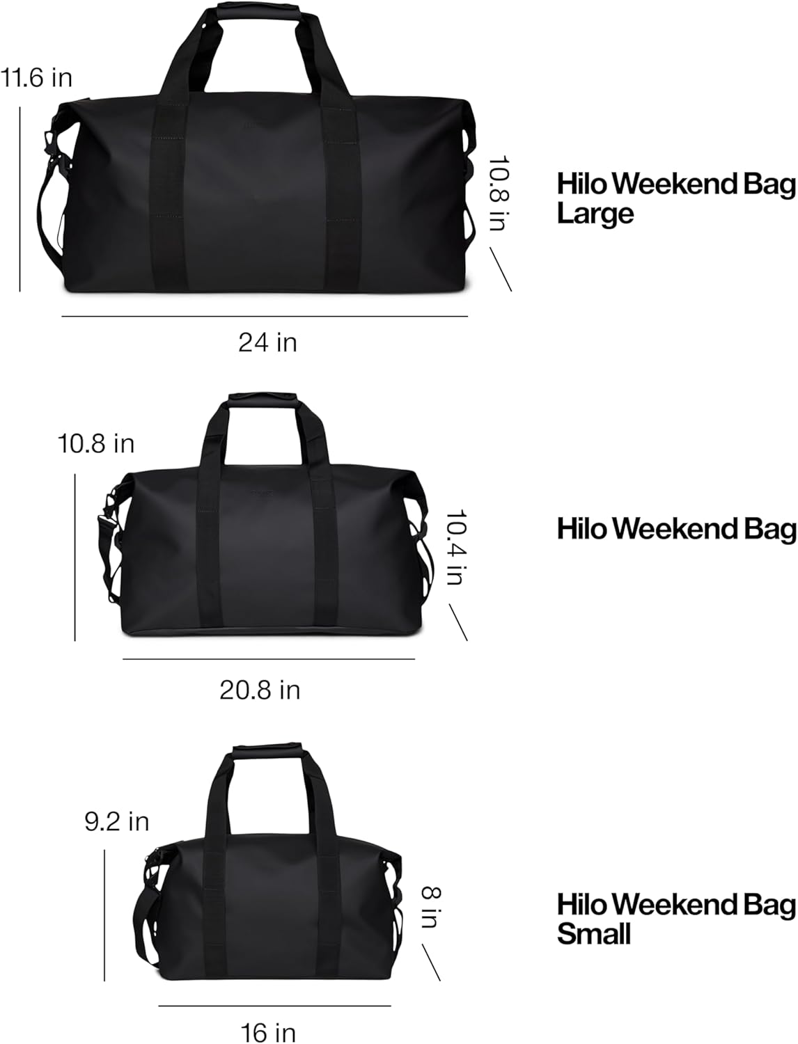- Wasserdicht: Diese wasserdichte Reisetasche ist Rains' Interpretation einer modernen Sport- oder Übernachtungstasche. Diese Wochenendtasche verfügt über ein einziges Hauptfach, gewebte Tragegriffe, einen abnehmbaren Schultergurt und verstellbare
