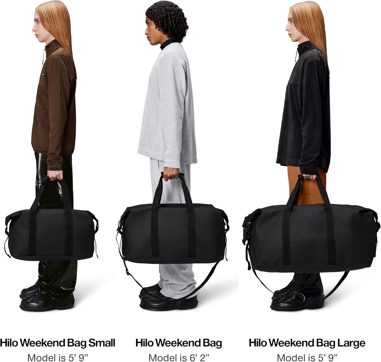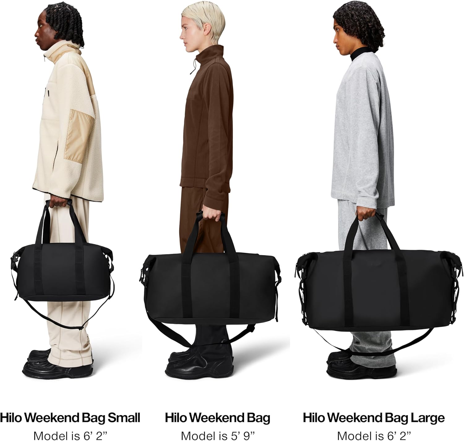 - RAINS Signatur-Design: Die Wochenendtasche hat einen Wassersäulendruck von 8000 mm und besteht aus 100 % Polyester mit Rains Signature PU-Gewebe (Polyurethan) als Beschichtung.