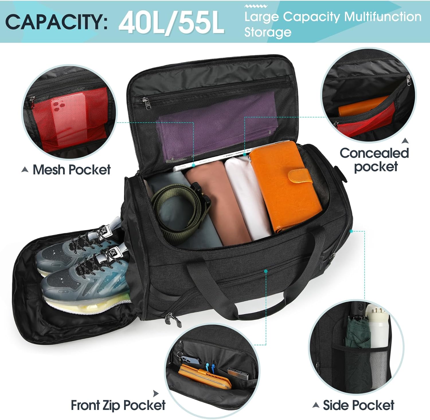 • 【Genug Platz】Mit 11 verschiedenen Fächern bietet diese Reisetasche viel Platz, darunter ein Hauptfach, 2 Seitentaschen, ein Nassfach und ein Schuhfach. Sie kann problemlos Kleidung, Mobiltelefone, Bücher, Brieftaschen, Schuhe und Reiseutensilien