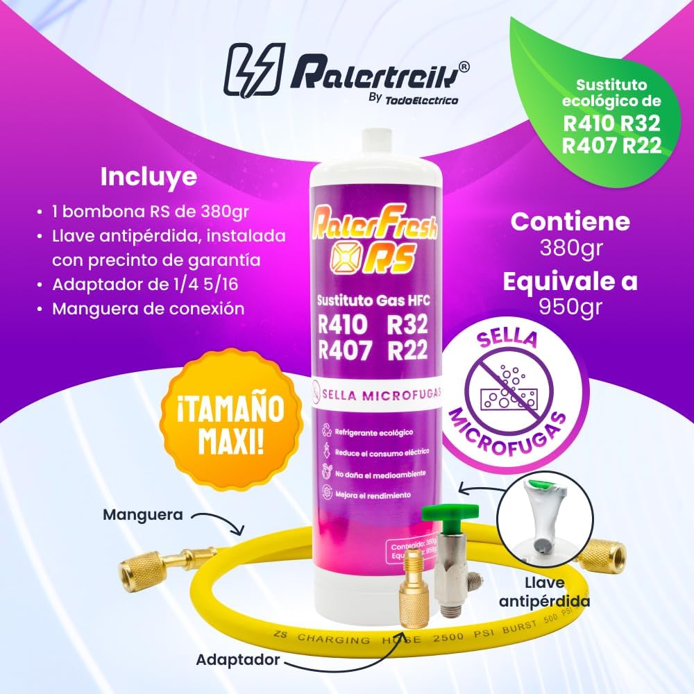 - [🌍 Umweltfreundliches und effizientes Kältemittelgas - NICHT fluoriert] Das Kältemittelgas Ralerfresh RS ist eine effiziente und umweltfreundliche Alternative für Split-Klimageräte. Es wurde als kompatibler Ersatz für R410, R32, R407 und R22