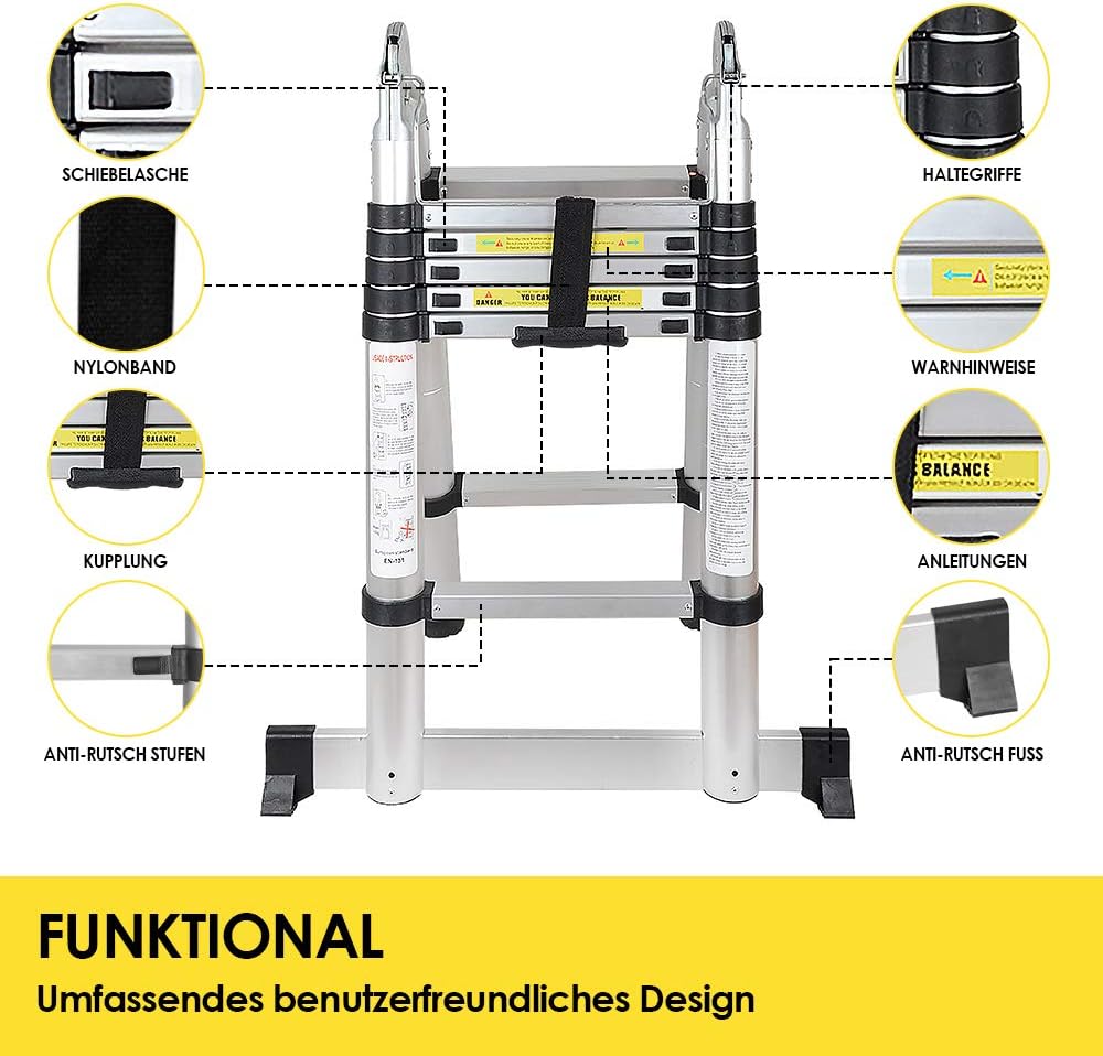 - ➤Sicher und Zuverlässig:Zwischen den Sprossen ist Finger Sicherheitseinstellungen vorhanden, um das Einklemmen der Finger beim Ein- und Ausfahren zu verhindern. Eine gummierte rutschfeste Stufe und ein stossdämpfender Riemen zwischen den Sprossen bilden eine solide Grundlage, ermöglicht die sichere Verwendung, wenn die Klappleiter vollständig ausgefahren ist.