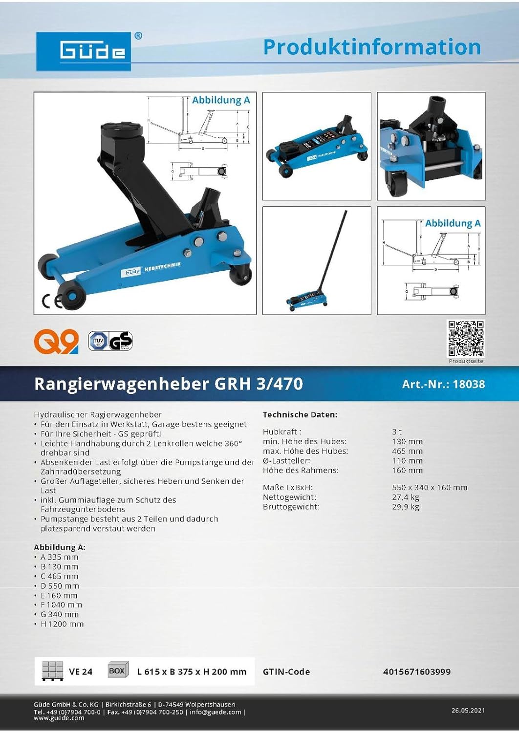 - Höhe (Hubarm ausgefahren): 465 mm