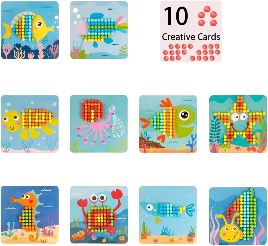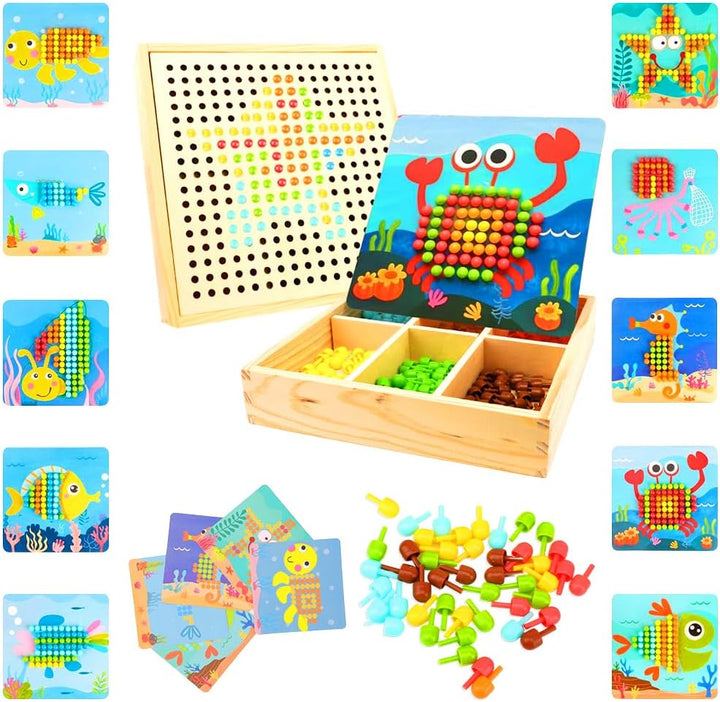 - 【Mosaik Steckspiel Set】Puzzle-Spielzeug Enthält eine Holz-Stecktafel, 10 Karten mit verschiedenen Bildern, 5 Referenzkarten, 240 Farbige Stifte.Es gibt genügend Zubehör, Geben Sie Ihrem Kind das beste Geschenk und machen Sie Ihr Kind jeden Tag
