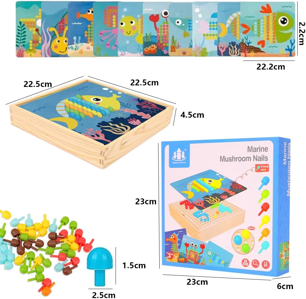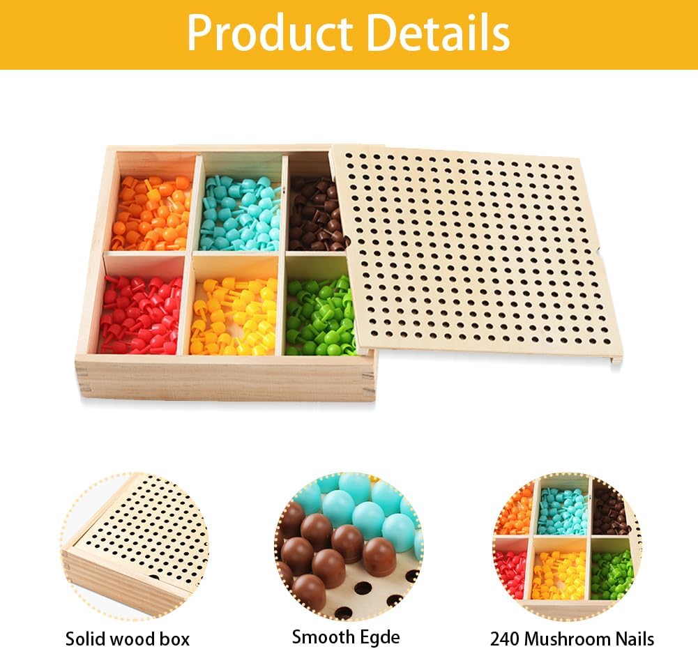 - 【Lernspielzeug für Vorschulkinder】Die farbenfrohen Pilzstifte werden von den Kindern je nach Farbe in die Holztafel gesteckt, kann um die Konzentration und Kreativität der Kinder, und sie können auch ihren Verstand trainieren, indem sie ihre