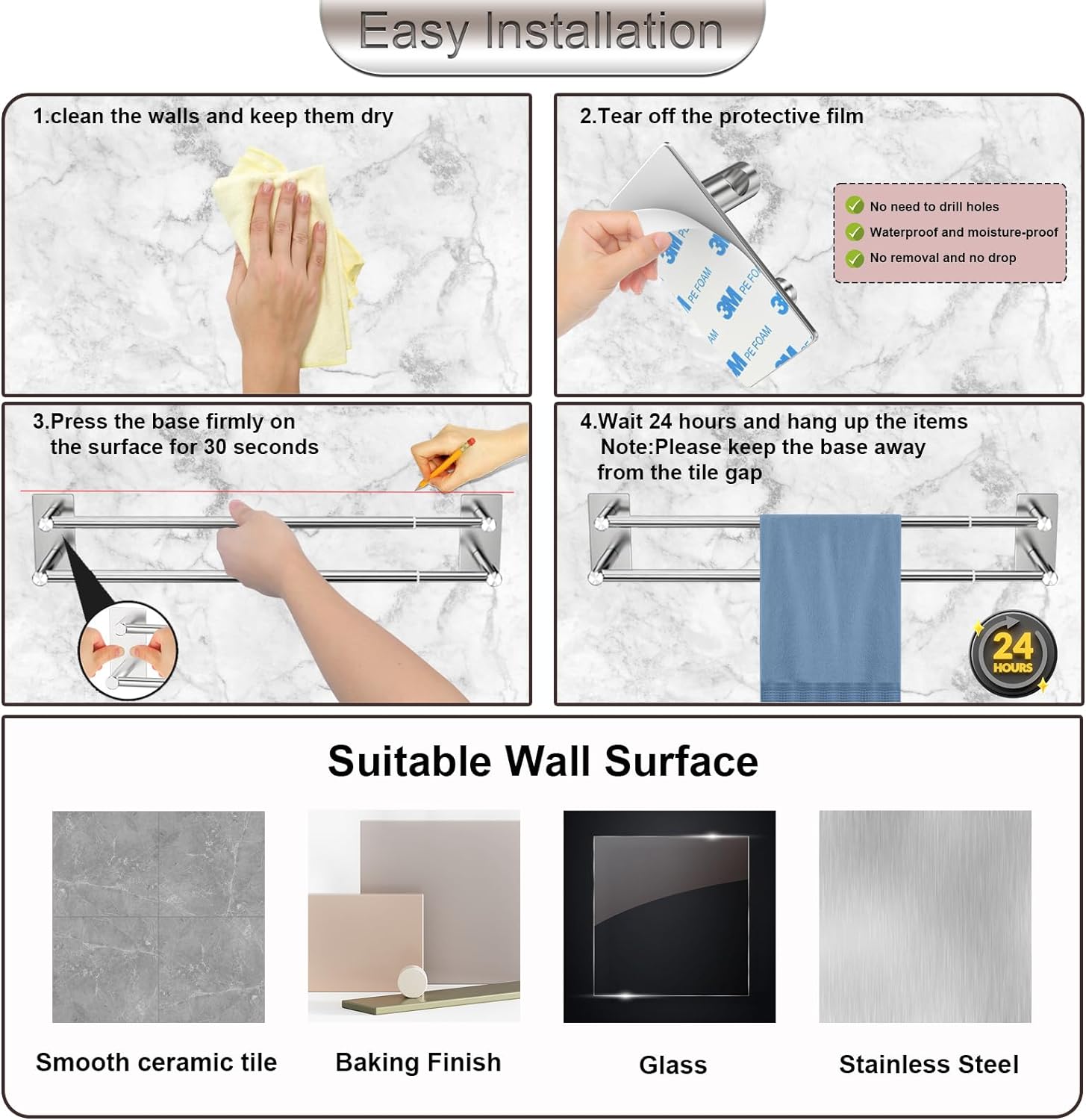 • 【Anwendung】Dieser selbstklebende Handtuchhalter funktioniert gut auf glatten und ebenen Oberflächen, wie Fliesen, Pflasterplatten, Glas, Metall, flachen Spiegel, Marmor, PVC usw. Bitte beachten Sie, dass dieser selbstklebende Handtuchhalter nicht