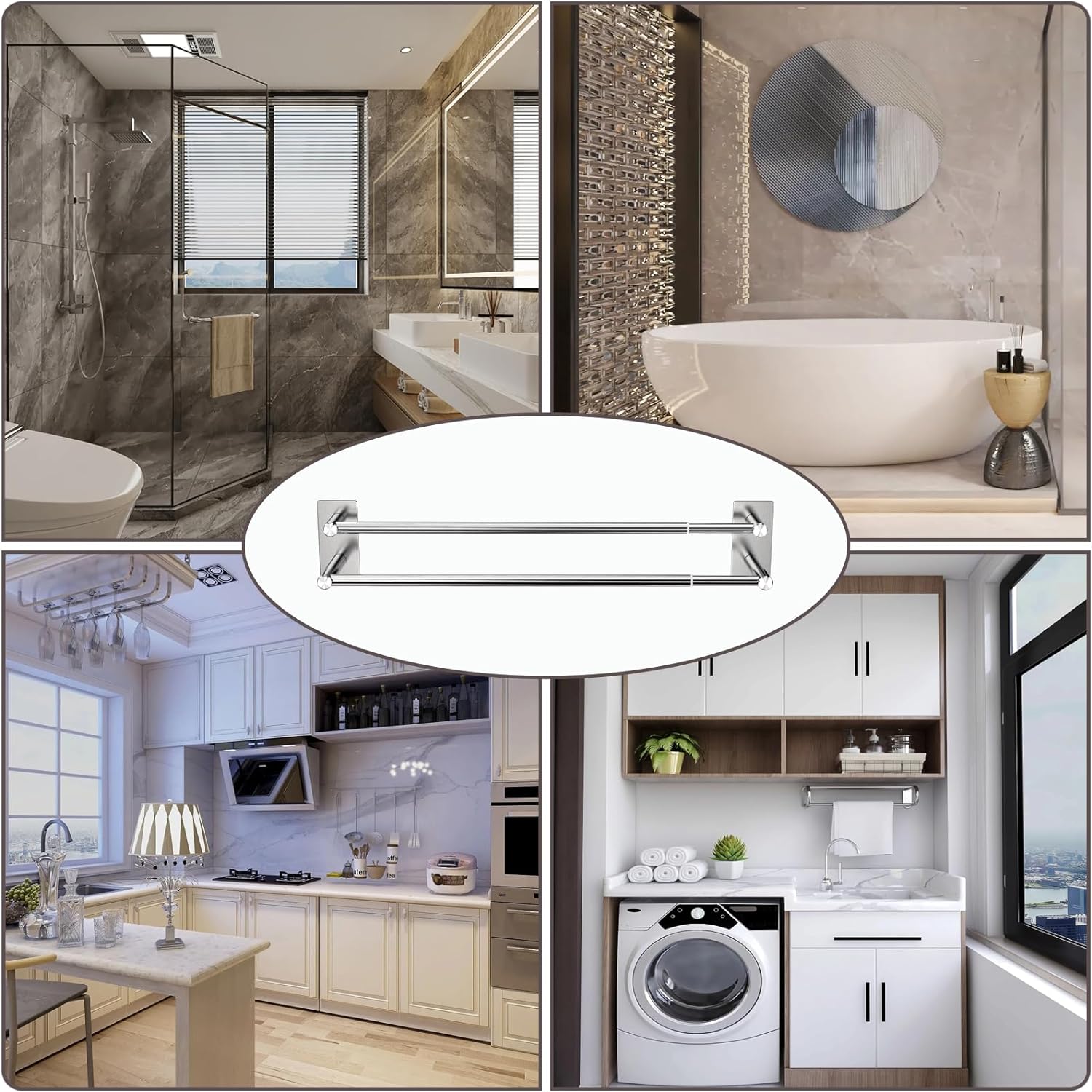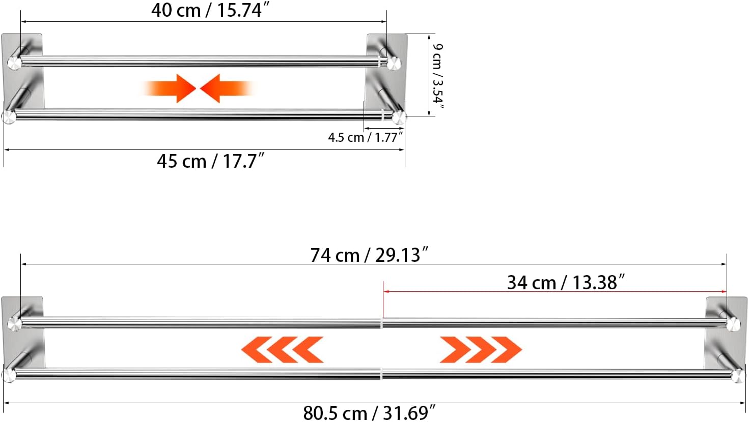 • 【Ausziehbare Handtuchhalter】 Verstellbare Handtuchstange von 40 cm bis 74 m, die nach Belieben zurückgezogen werden kann, sehr bequem zu bedienen. Doppellagiges Handtuchstangen-Design kann mehr Bademäntel und Badetücher aufbewahren.