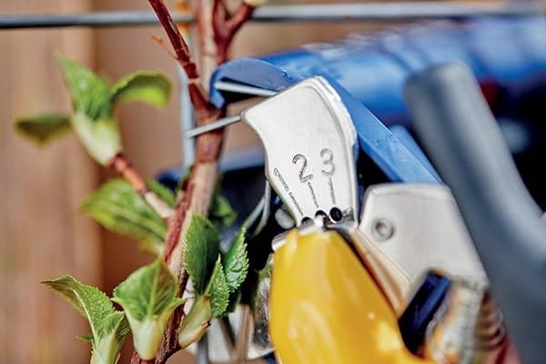 - 3-stufiges Verschluss-System zur Anpassung an den Durchmesser der Pflanze und ihrer Stütze, Integriertes Magazin mit hoher Ladekapazität, Einfach und schnell zu laden, Ergonomischer Griff mit Softgrip, Griffverriegelung für einfaches Verstauen,