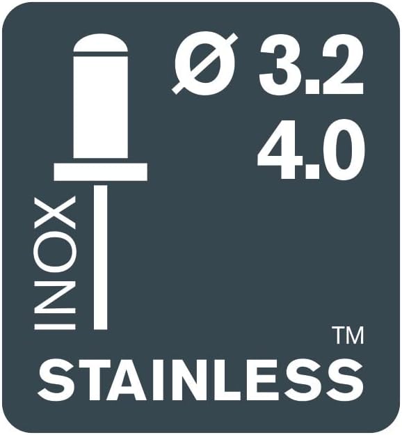 • Verarbeitet Aluminium Niete mit Durchmesser 3,2, 4,0 und 4,8 mm sowie Niete aus rostfreiem Edelstahl mit Durchmesser 3,2 und 4,0 mm. Dank ihres einzigartigen Universalmundstücks kann die Nietzange RP40 Multi ohne Wechsel des Mundstücks verwendet werden