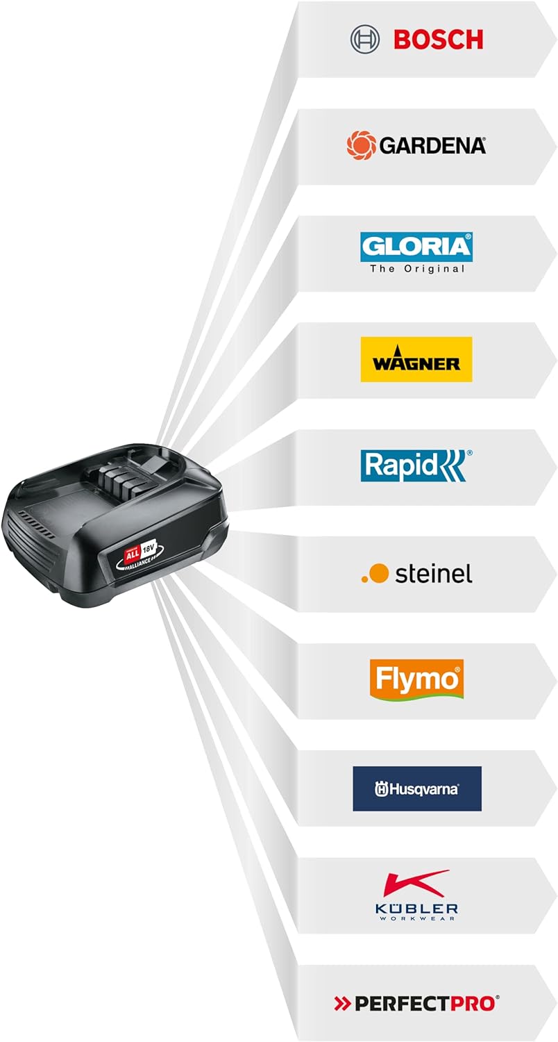 - POWER FOR ALL 18V Akku, Kompatibel mit allen Rapid 18V Elektrowerkzeugen sowie mit zahlreichen anderen Produkten der teilnehmenden Marken der POWER FOR ALL ALLIANCE wie Bosch, Gardena, Gloria und Wagner