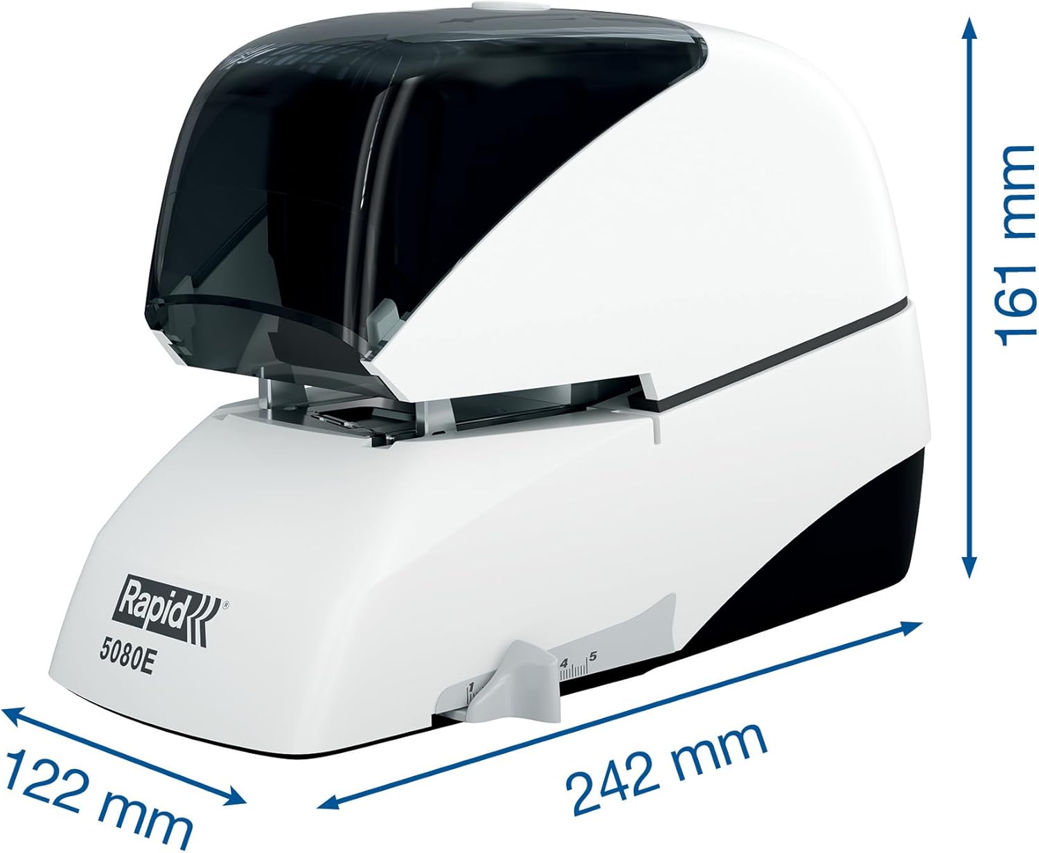 - Lieferumfang: 1 Rapid Elektrisches Heftgerät, Silber/Orange, 20993411, Inkl. einer Kassette mit 5000 Klammern, Abmessungen: 17 x 21 x 41 cm