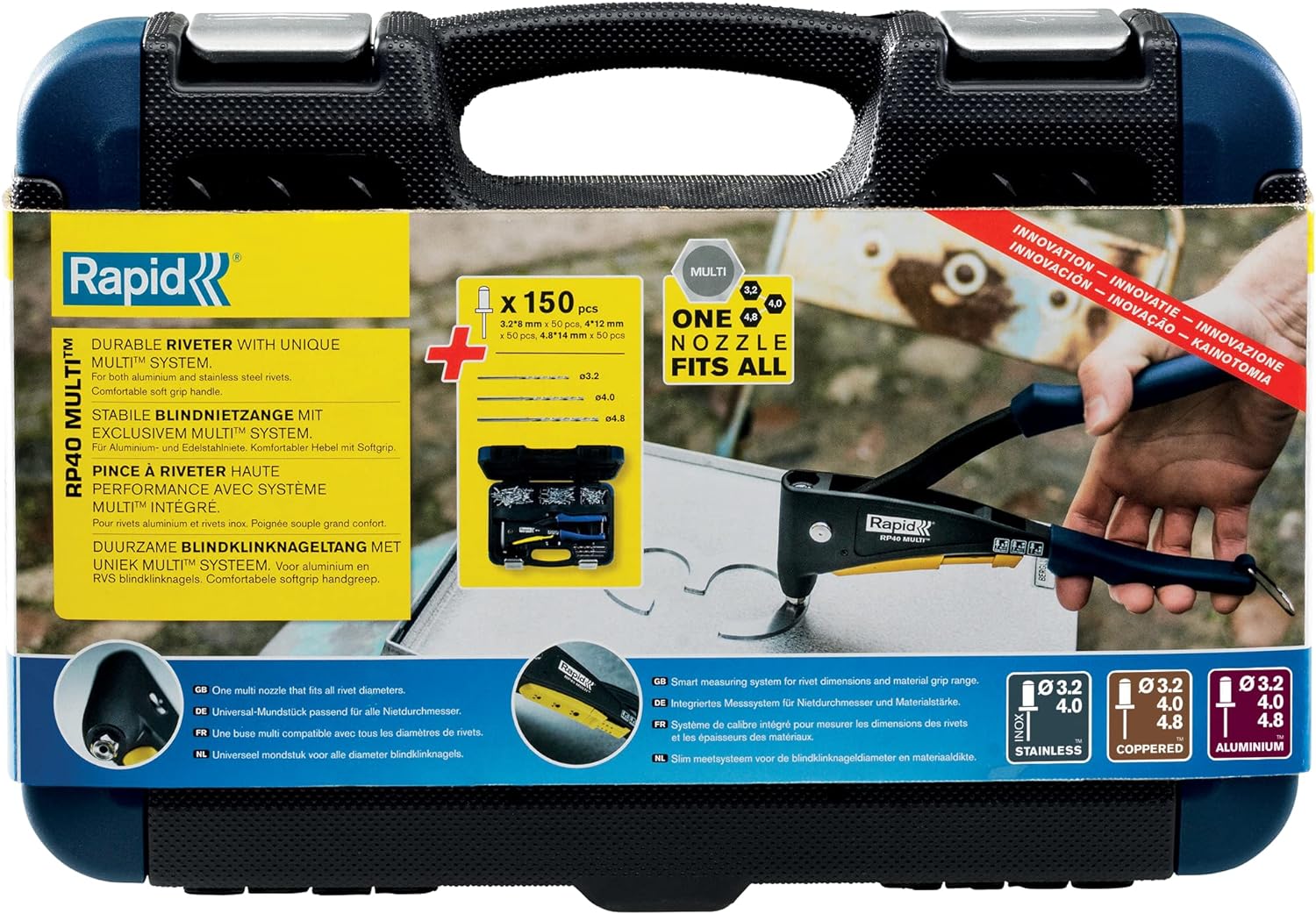 - Lieferumfang: 1 Stk. Rapid RP40 Multi Blindnietzange, Kunststoffkoffer, 3 Bohrer (3,2/4,0/4,8 mm), 50 Stk. Niete 3,2x8 mm, 50 Stk. Niete 4,0x12 mm, 50 Stk. Niete 4,8x14mm, Montageschlüssel, 5001127, Abmessungen BxHxT:25,5x10,5x2,4 cm, Gerätegewicht: