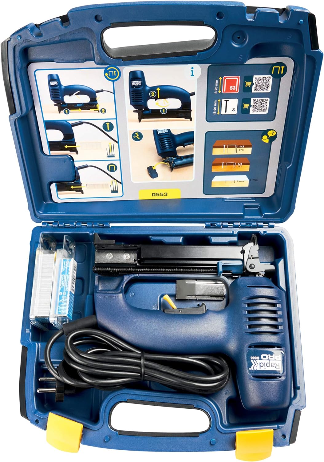 - Inhalt: 1 elektrisches Heftgerät Rapid R553, 10642912, Lieferumfang: 1250 Heftklammern Nr. 53 und 1000 Nägel Nr. 8, Kabellänge 350 cm, BxTxH: 21,3 x 19 x 6 cm, Gewicht: 1,6 kg