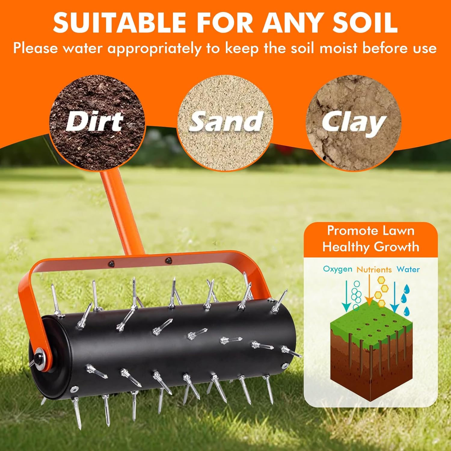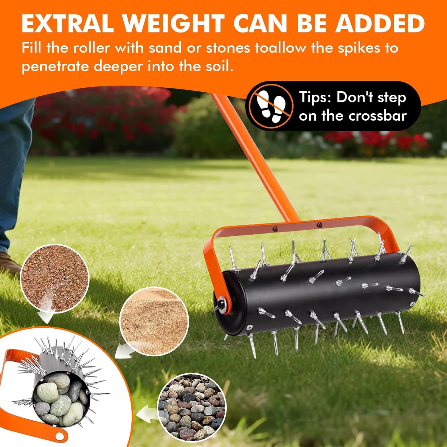 - FÜLLBARE TROMMEL FÜR TIEFERE BODENBELÜFTUNG: Die integrierte Trommel des Handvertikutierer kann Sand oder kleinen Steinen befüllt werden. Das zusätzliche Gewicht sorgt dafür, dass die Spikes tiefer in den Boden eindringen, was die Bodenbelüftung