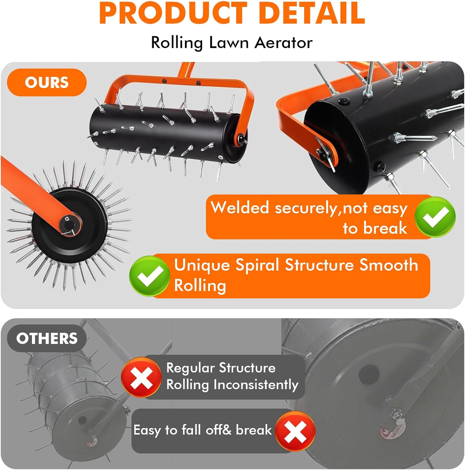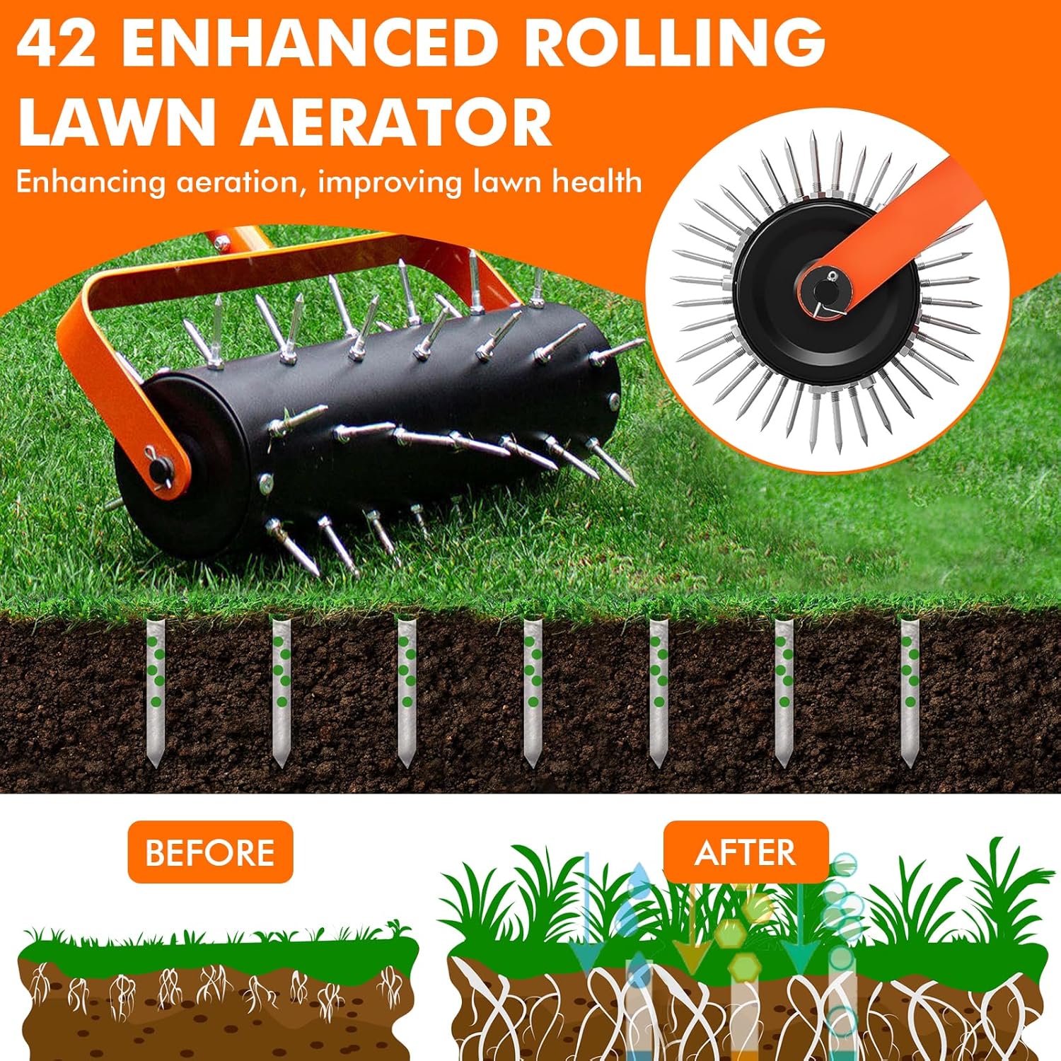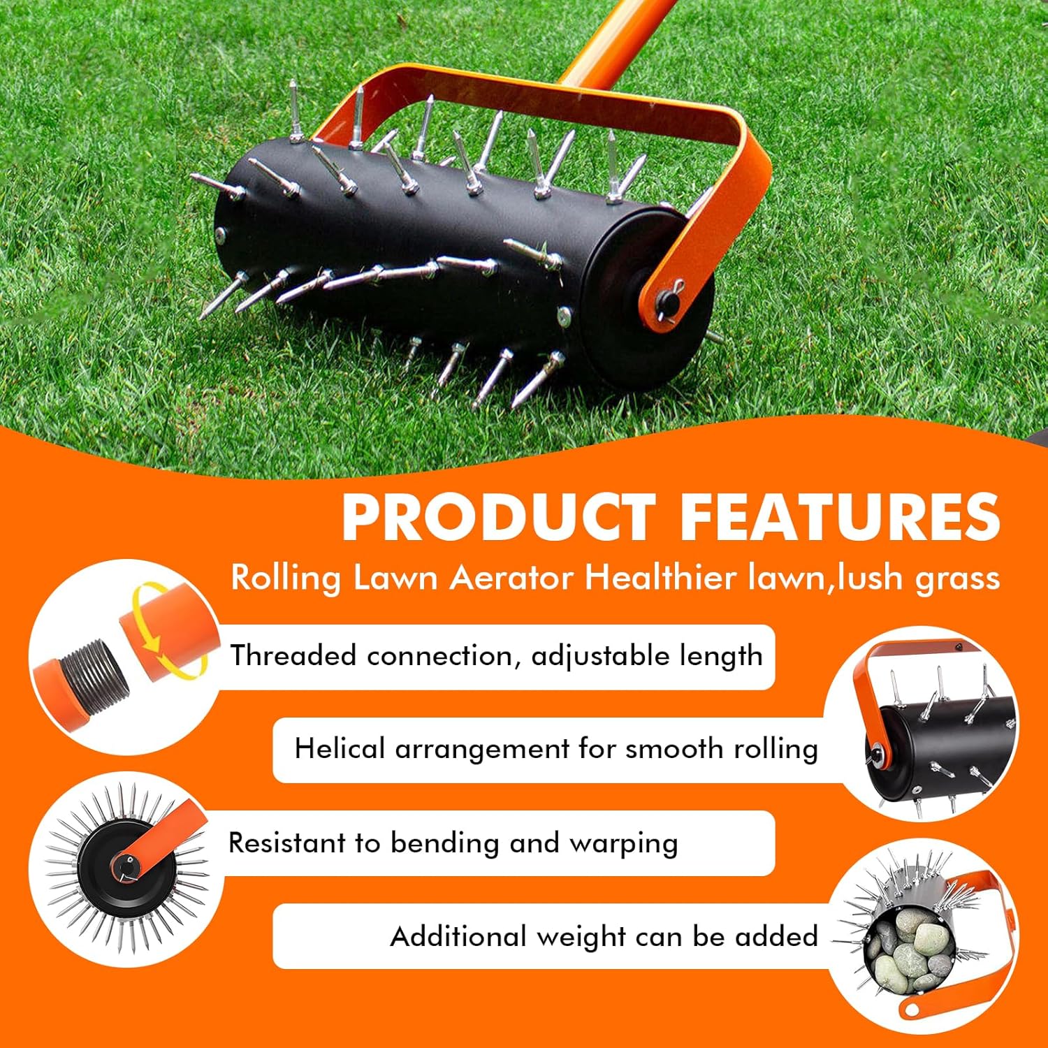 - VERSTELLBARER ERGONOMISCHER STIEL: Die rasenlüfter walze besteht aus drei miteinander verbundenen Rohren mit einer Länge von 180 cm. kann der rasen aerifizierer an Ihre Körpergrösse angepasst werden. Dies sorgt für rückenschonendes Arbeiten ohne