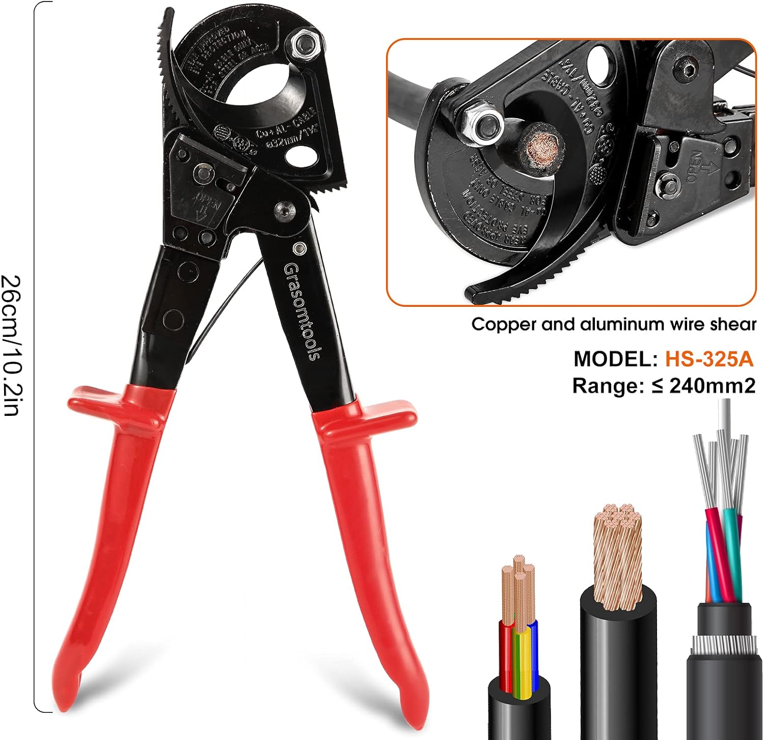 - Anwendung: Dieser robuste Ratschen-Kabelschneider hat ein mechanisches Design, das leicht Kupfer- oder Aluminium-Kabel schneidet. Die schlanke, kompakte Konstruktion ermöglicht das Schneiden von Kabeln in engen Bereichen. Rutschfeste