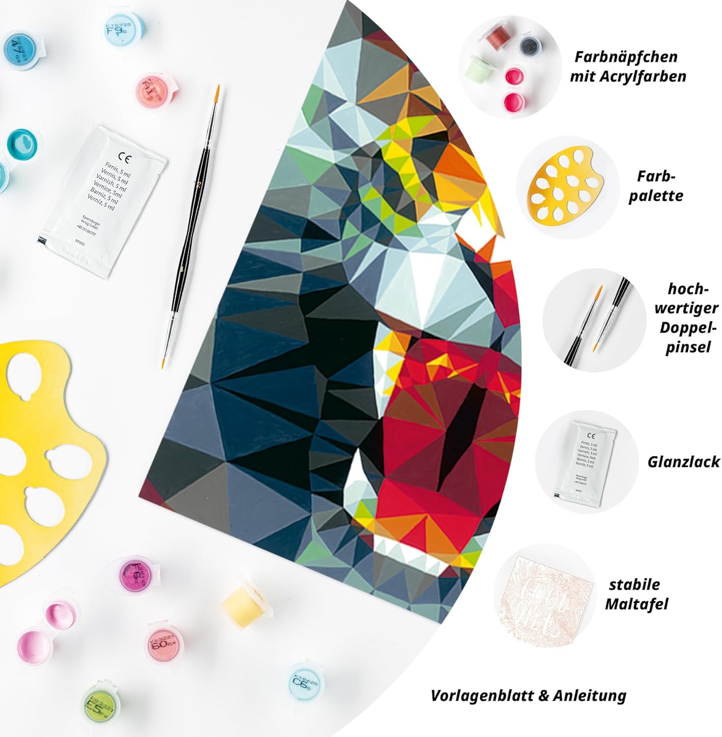 - Malset enthält: Acrylfarben in wiederverschliessbaren, nummerierten Näpfchen, Maltafel im Format 24x30 cm, Glanzlack zur Veredelung, Pinsel, Anleitung - Farben trocknen schnell, sind auf Wasserbasis, geruchsneutral und benötigen keinen Pinselreiniger