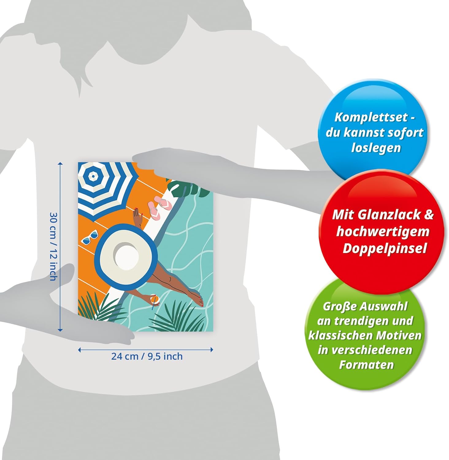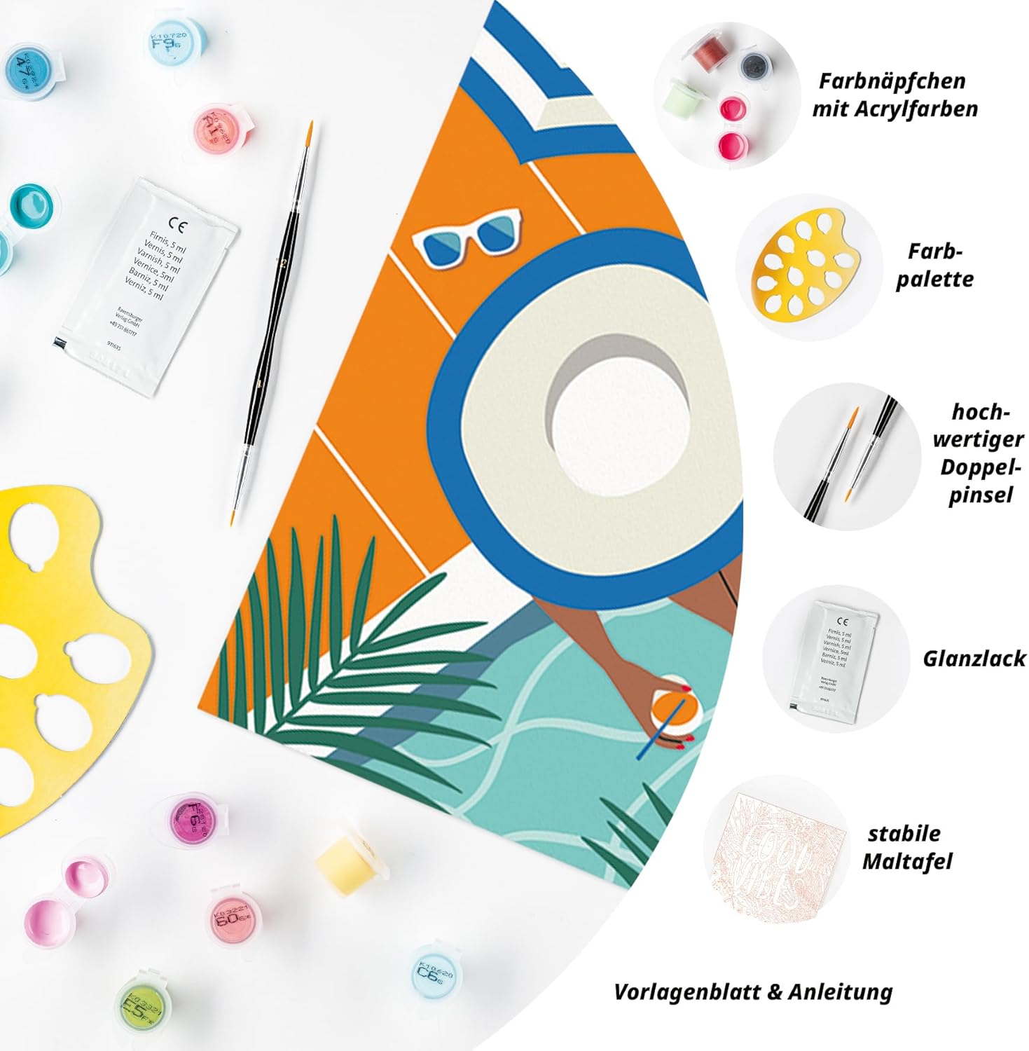 - Malset enthält: Acrylfarben in wiederverschliessbaren, nummerierten Näpfchen, Maltafel im Format 24x30 cm, Glanzlack zur Veredelung, Pinsel, Anleitung - Farben trocknen schnell, sind auf Wasserbasis, geruchsneutral und benötigen keinen Pinselreiniger