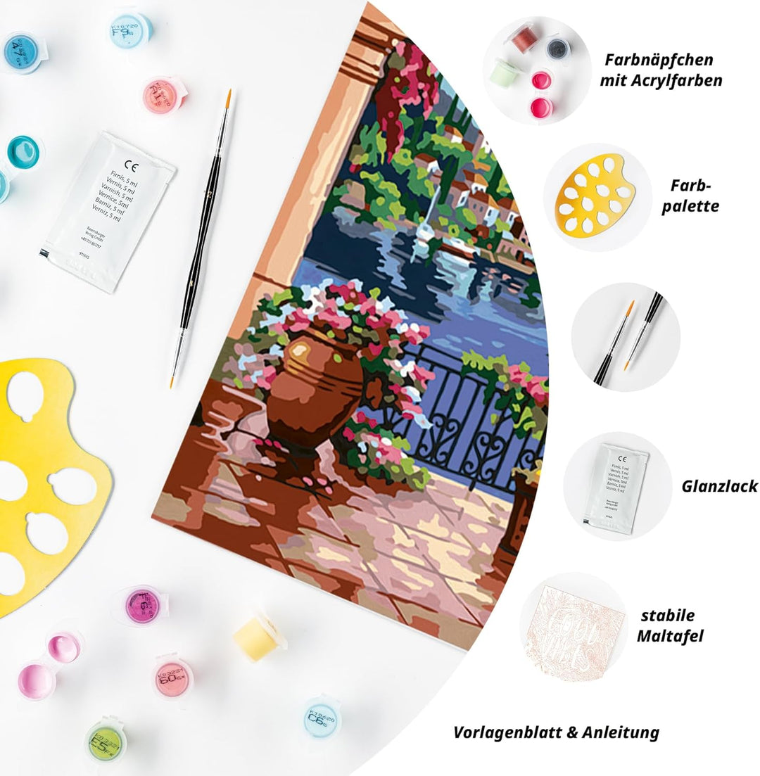 - Malset enthält: Acrylfarben in wiederverschliessbaren, nummerierten Näpfchen, Maltafel im Format 30x40 cm, Glanzlack zur Veredelung, Pinsel, Anleitung - Farben trocknen schnell, sind auf Wasserbasis, geruchsneutral und benötigen keinen Pinselreiniger